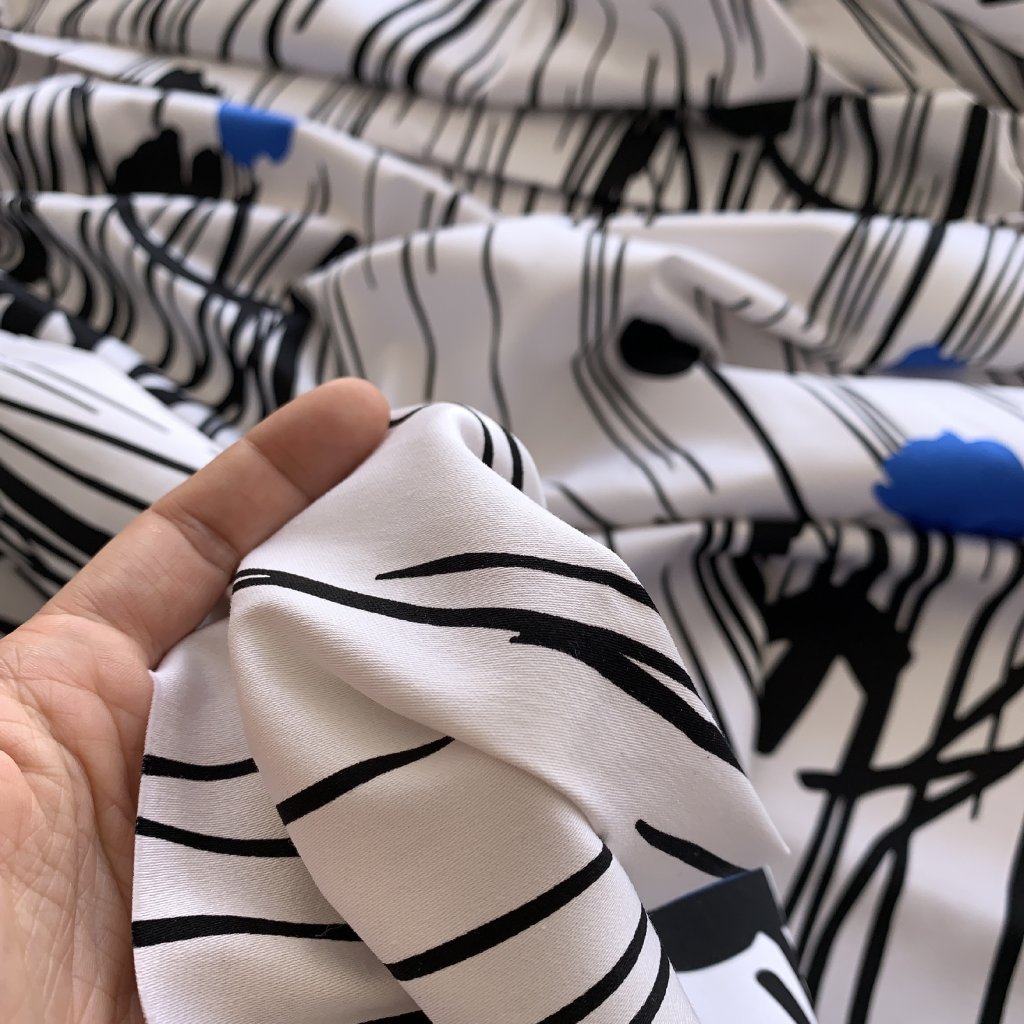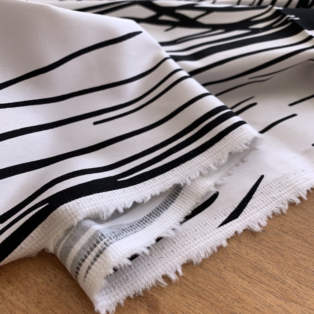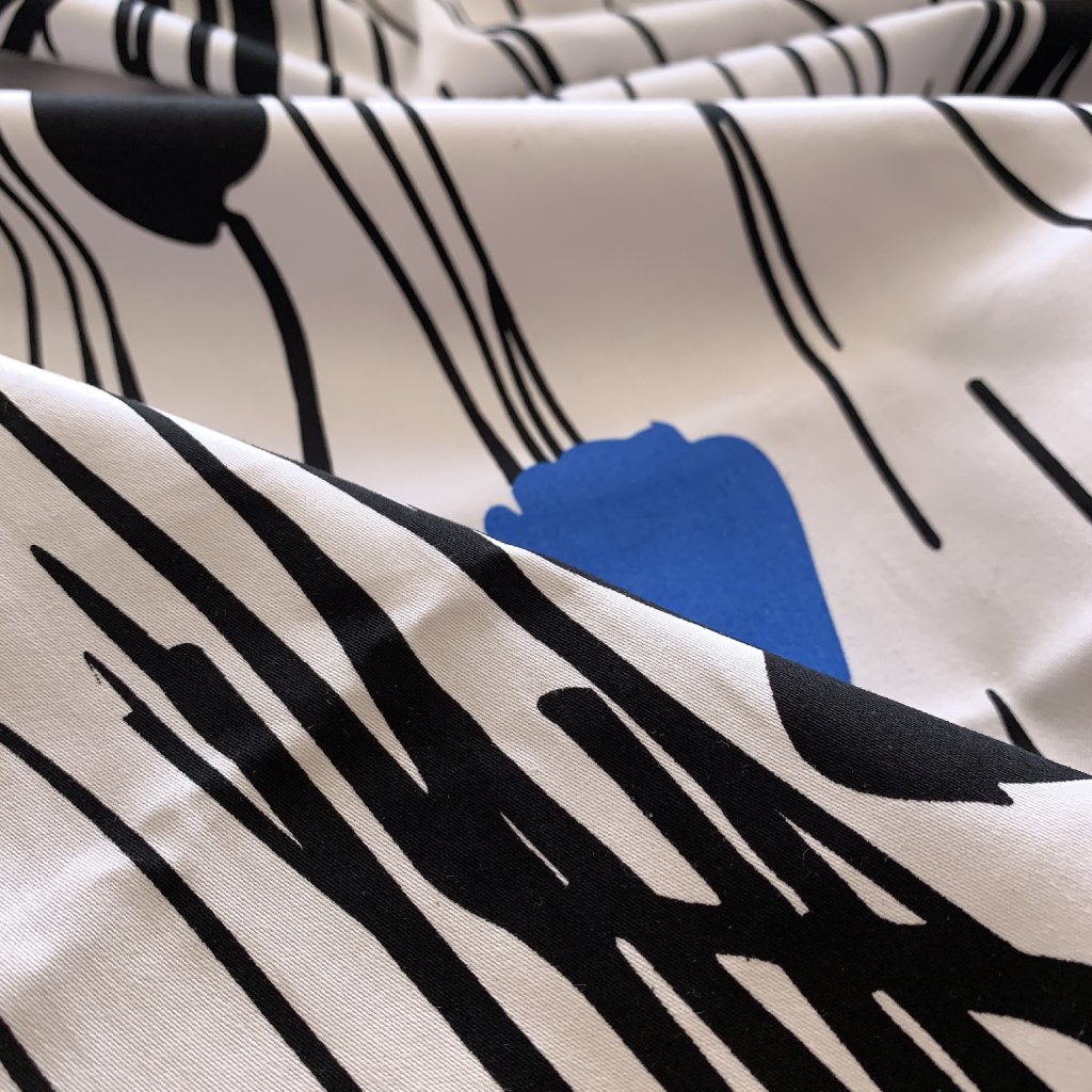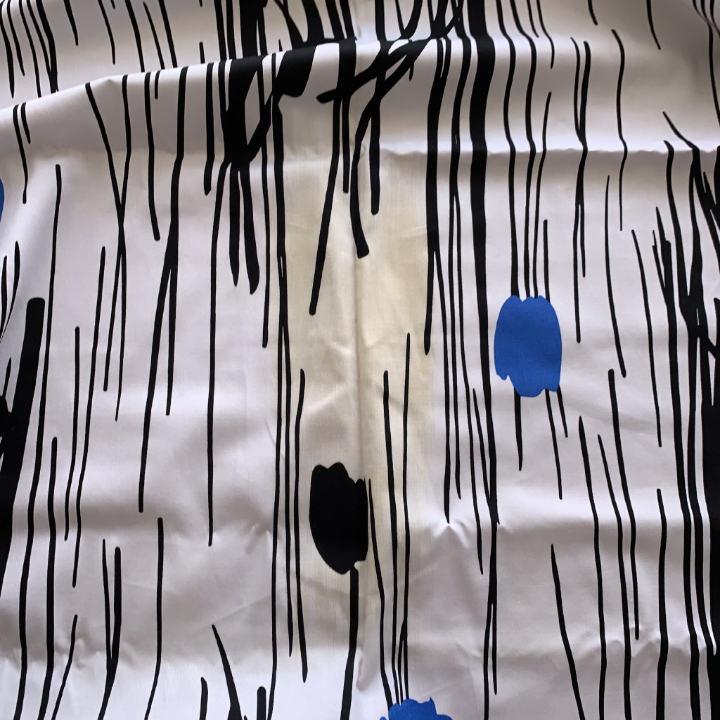 Bavlněný satén s elastanem, abstraktni vzor na bílé KAZ- Velký flek ve stredu látky, jeden na kraji