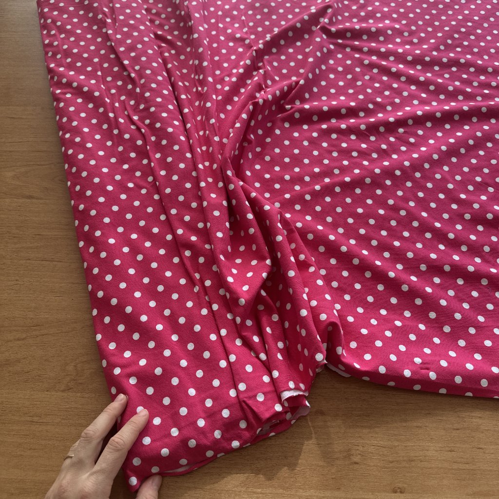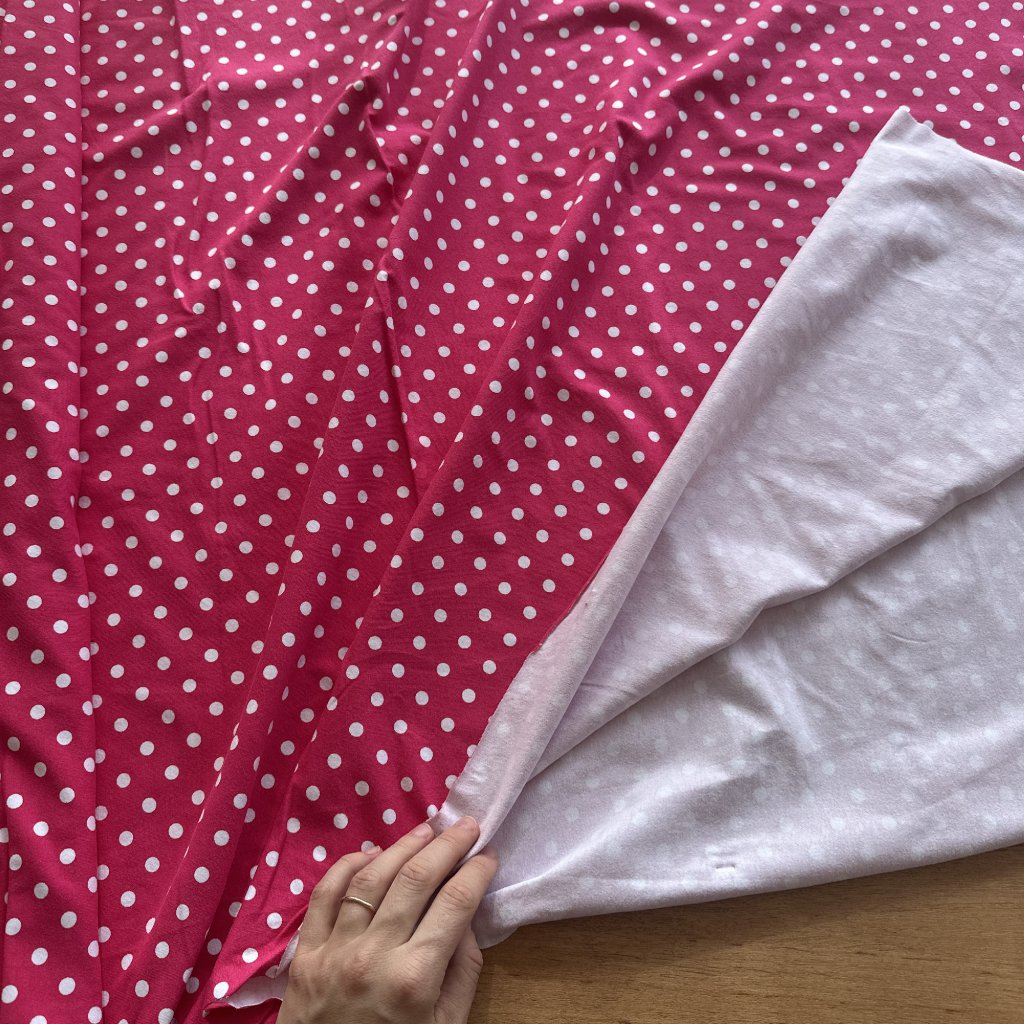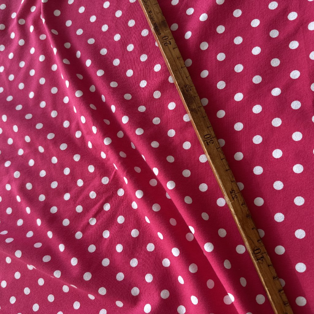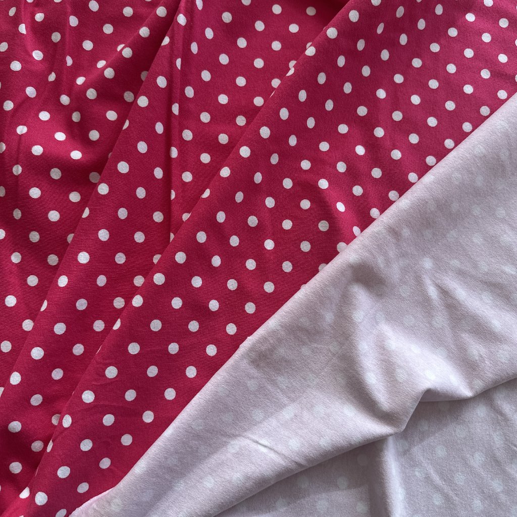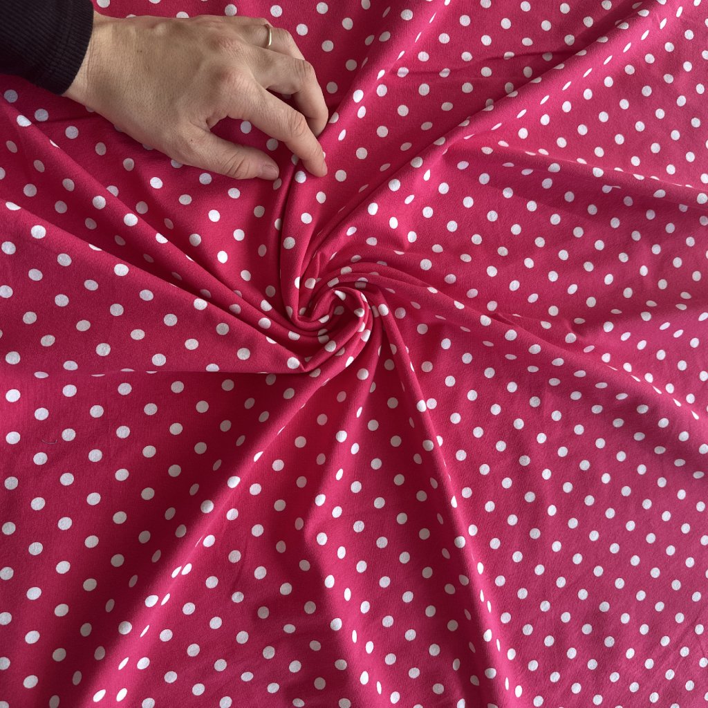 Bavlněný tričkový úplet s elastanem, růžová a bílý puntík