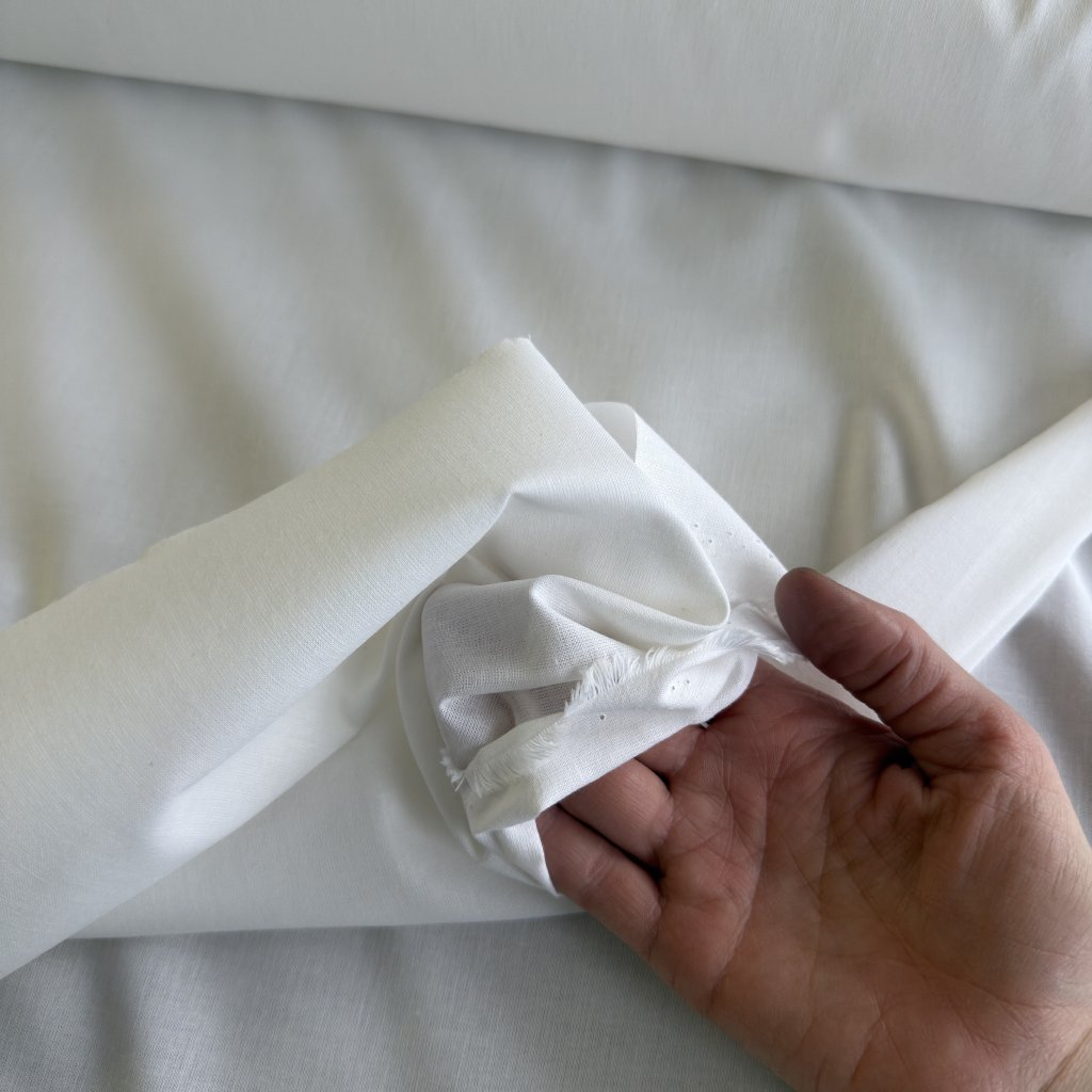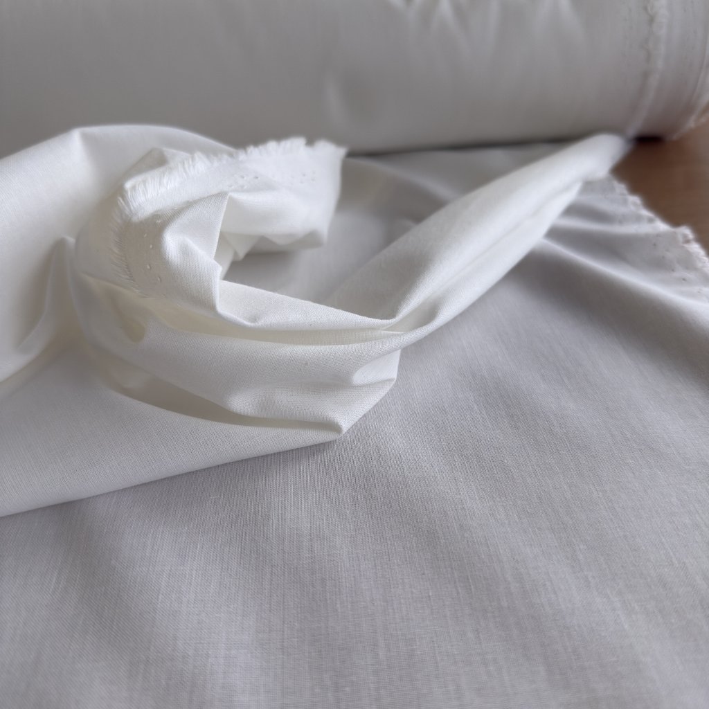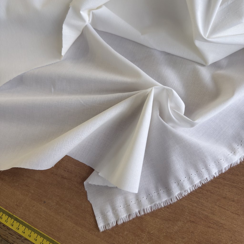 Tohle naprosto univerzální bílé bavlněné plátno/popelín se hodí na kapesníky, lehké halenky, na řasené výrobky a další. Plátno je vyrobené v České republice a je to takový pozůstatek na covidové časy, protože z těchto rolí se původně šily roušky. Díky bohu, že už z něj můžeme vyrábět něco jiného a krásnějšího. Odkoupili jsme ho jako nevyužitý materiál z šicí dílny. Dílna stále funguje, ale postupně se zbavuje materiálů, které již nevyužije, protože se majitelé postupně chystají do důchodu.