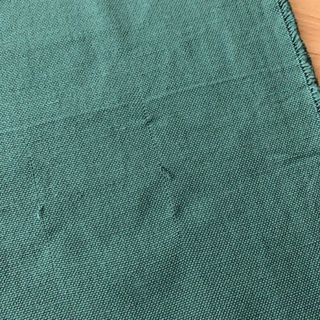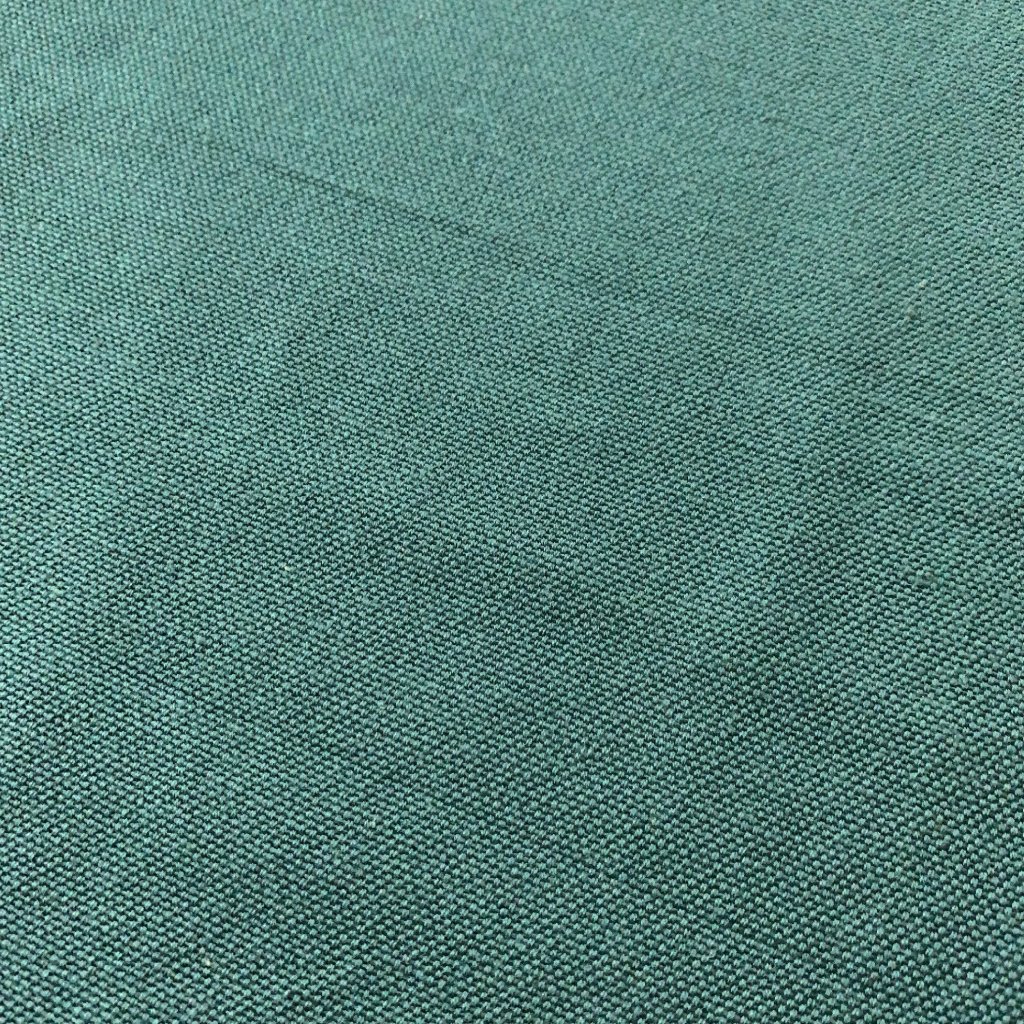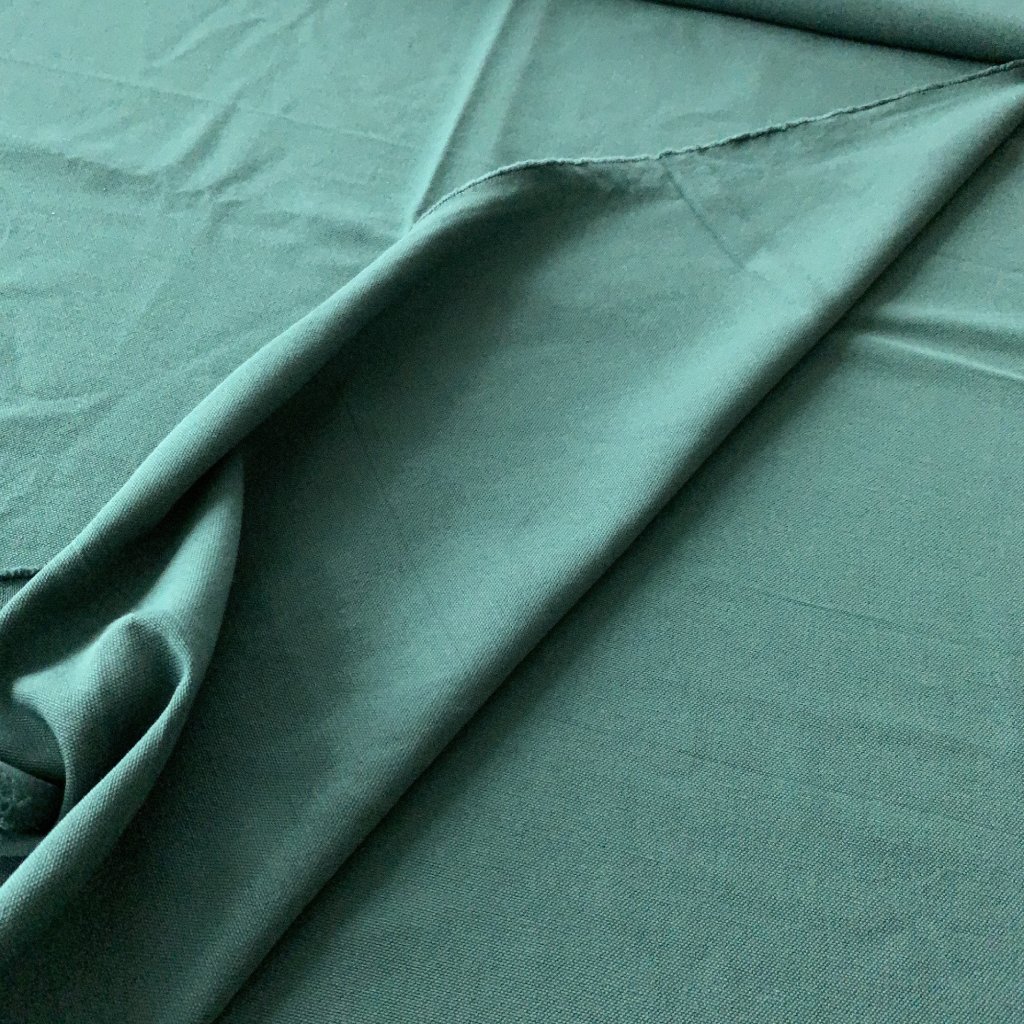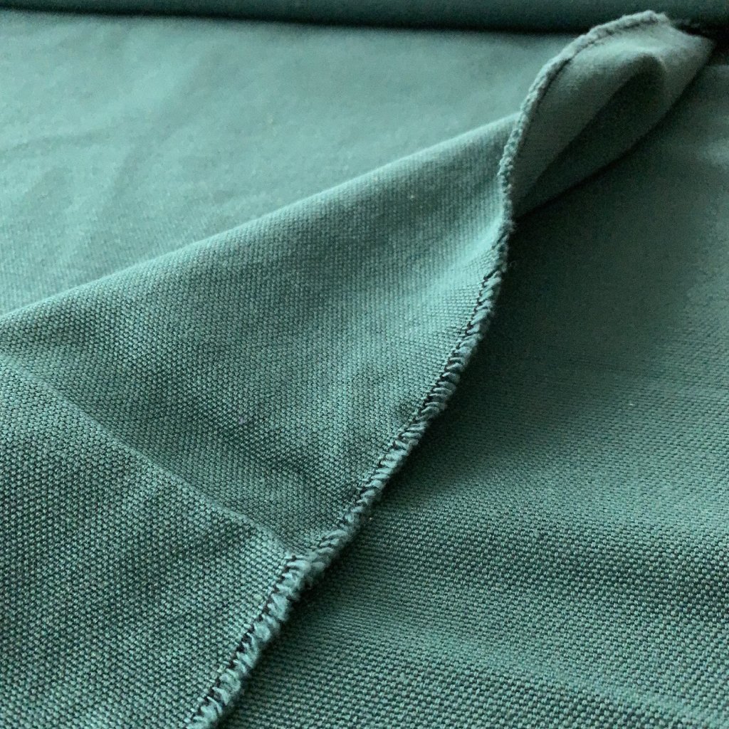 Hrubší bavlněné plátno, lahvově zelené, na začátku návinu vytažená nitka viz foto