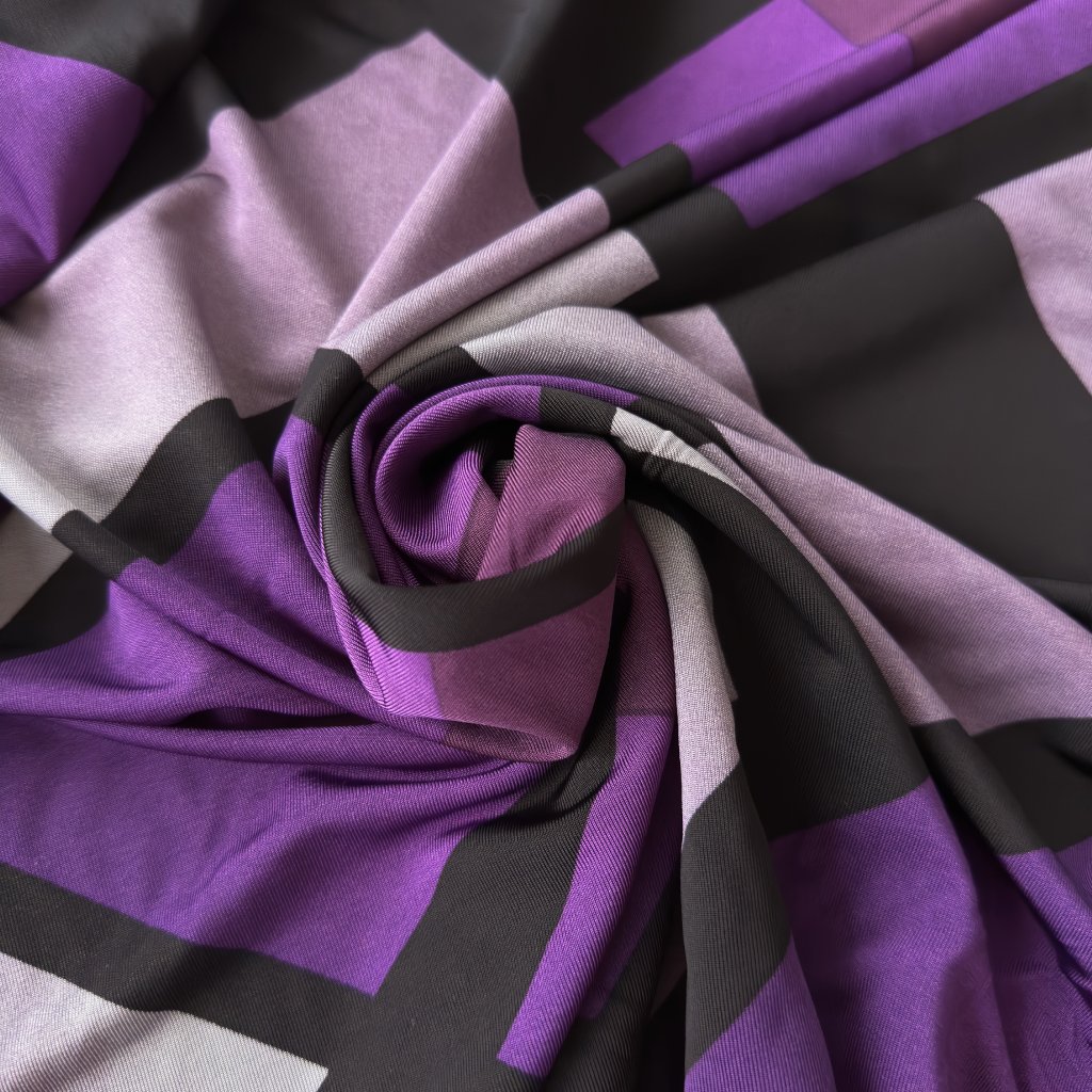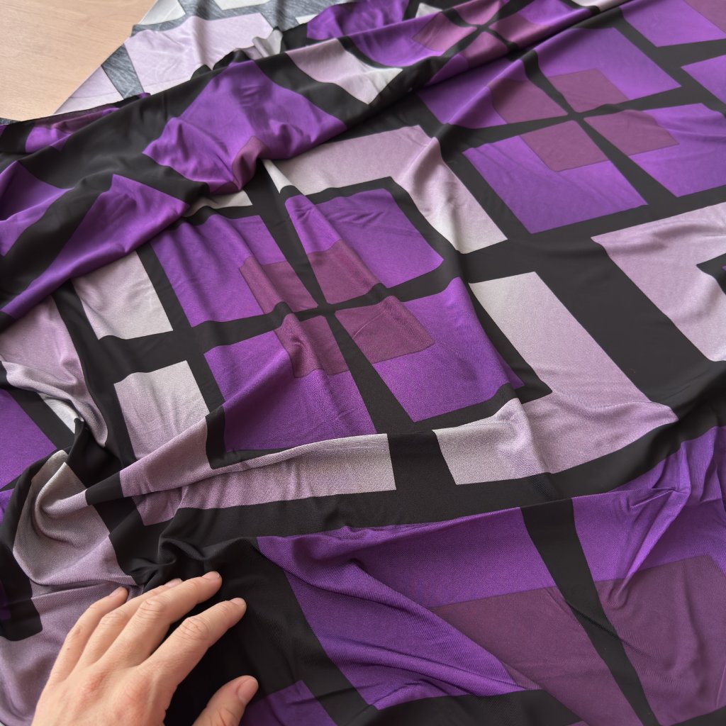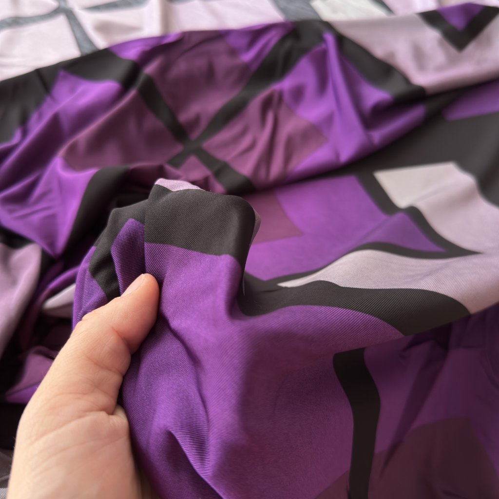 Lesklý sportovní úplet s geometrickým vzorem, fialová černá syntetika pružný splývavý