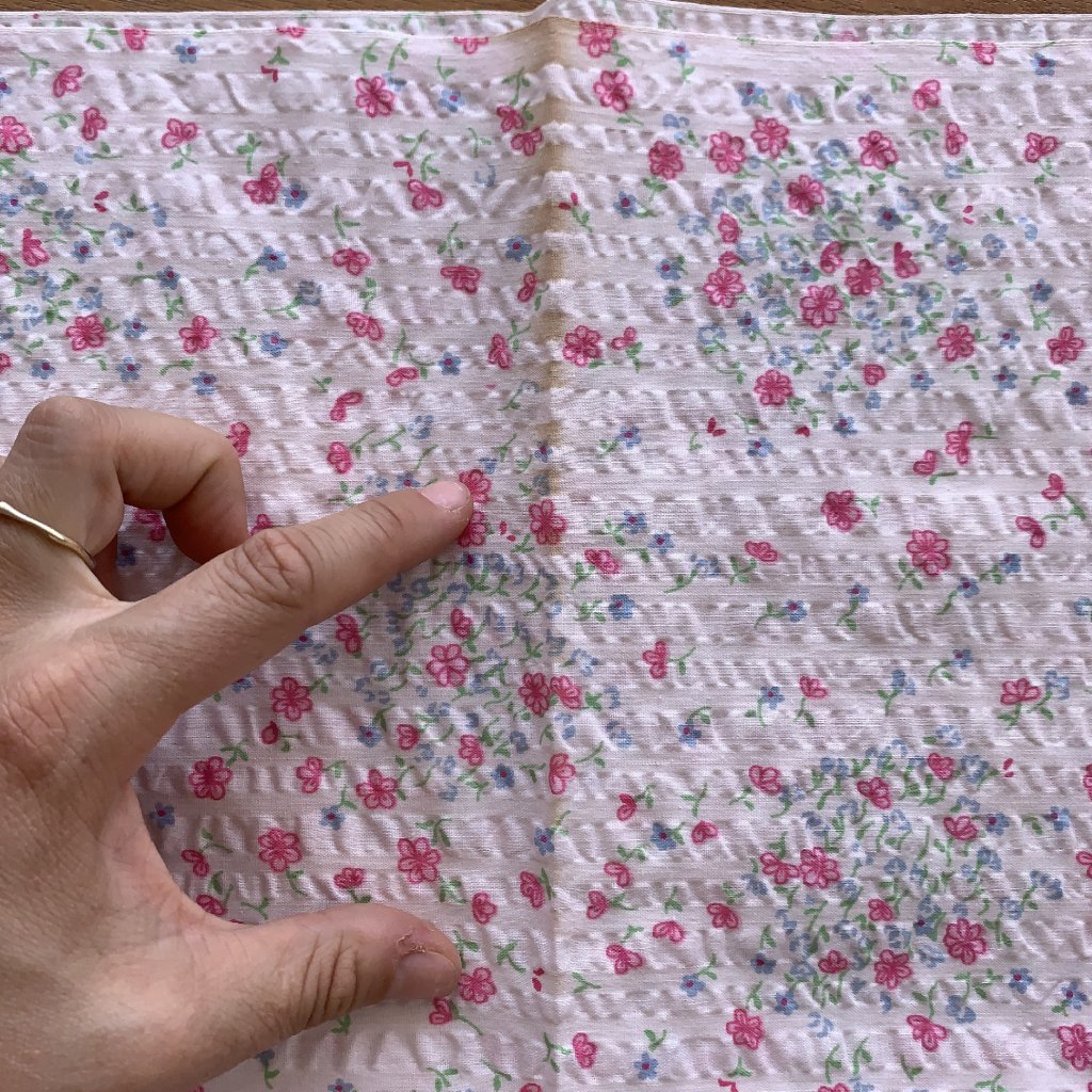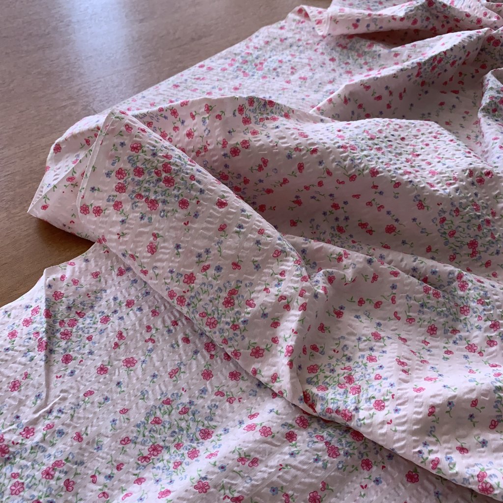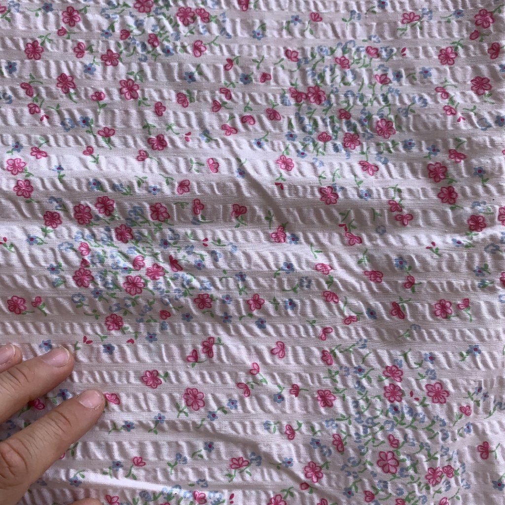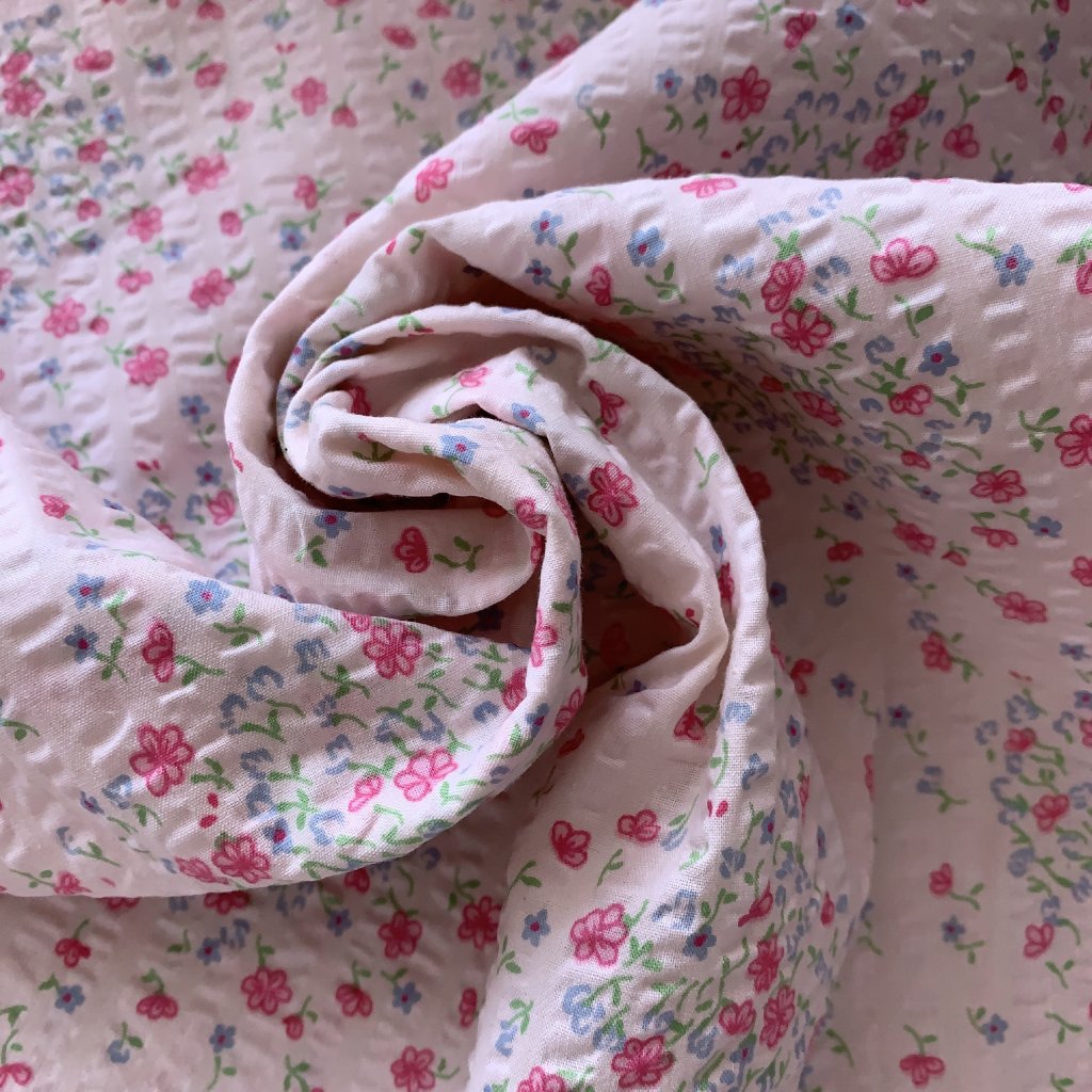 Mačkaná bavlna/krep drobné kvítky na růžové, může být lehce zašlé v přehybu viz foto