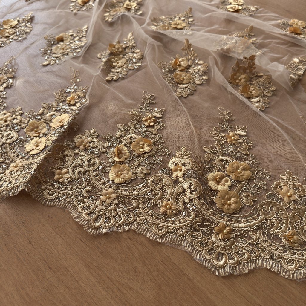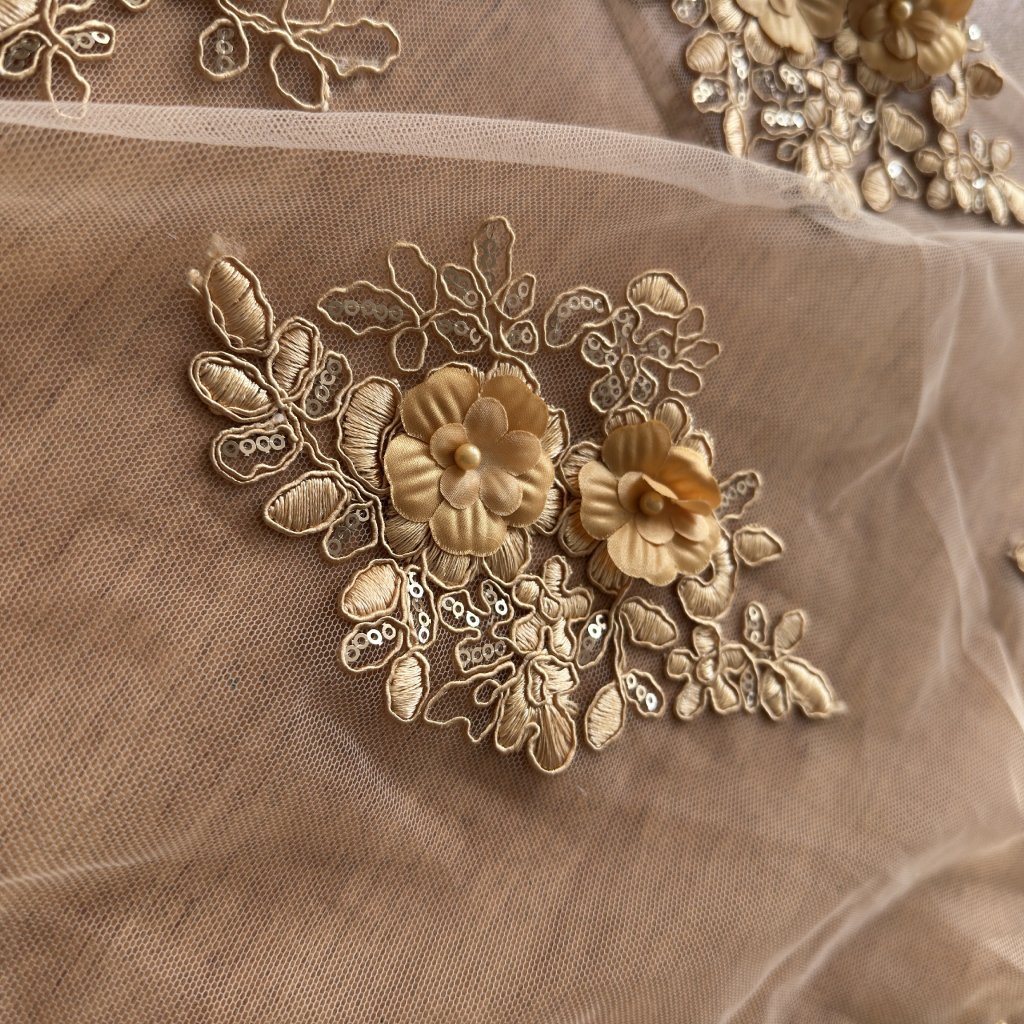 Medově zlatý tyl s výšivkou flitry a korálkami 2