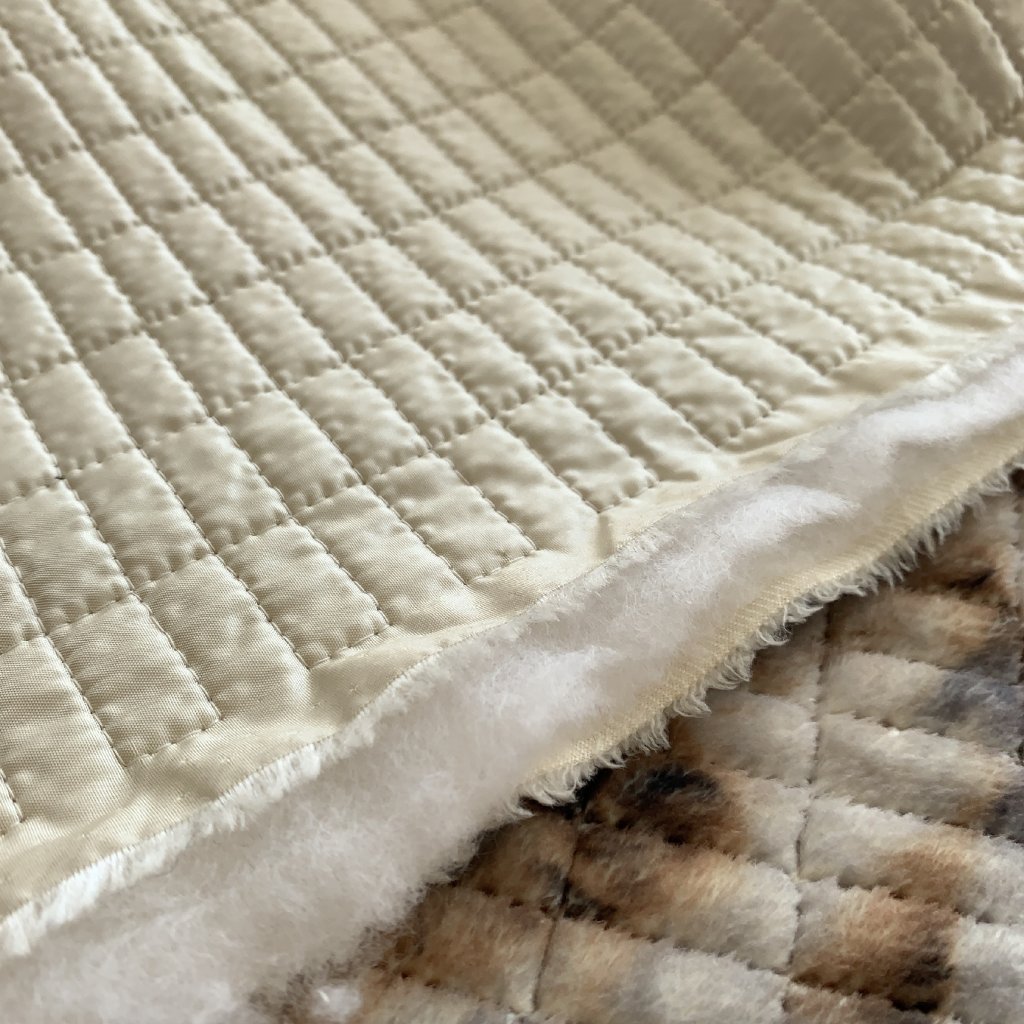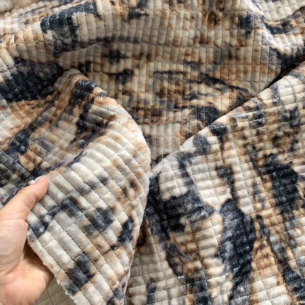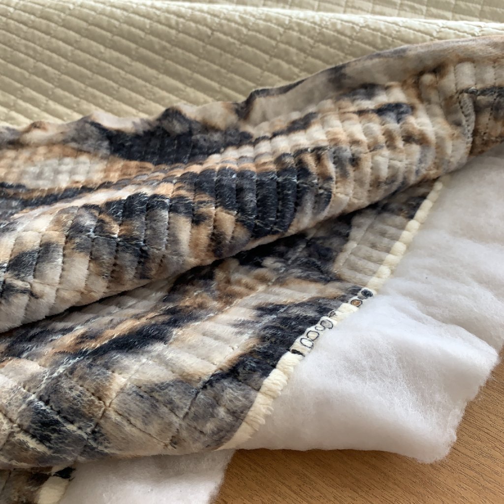 Oboustranný prošev, krémový šusťák a umělý fleece se zvířecím vzorem