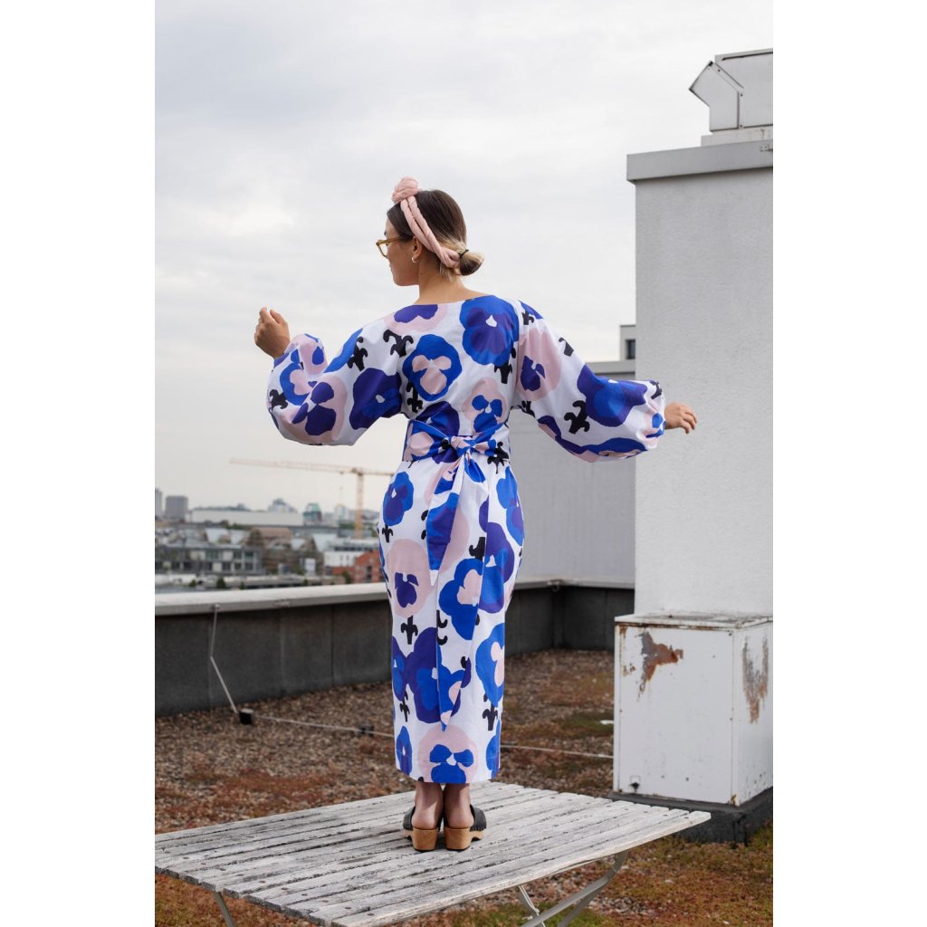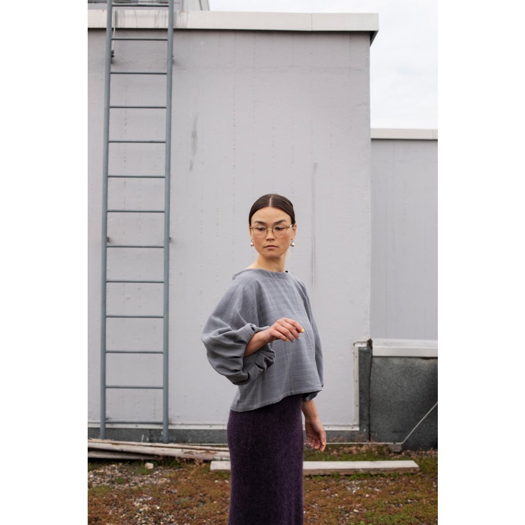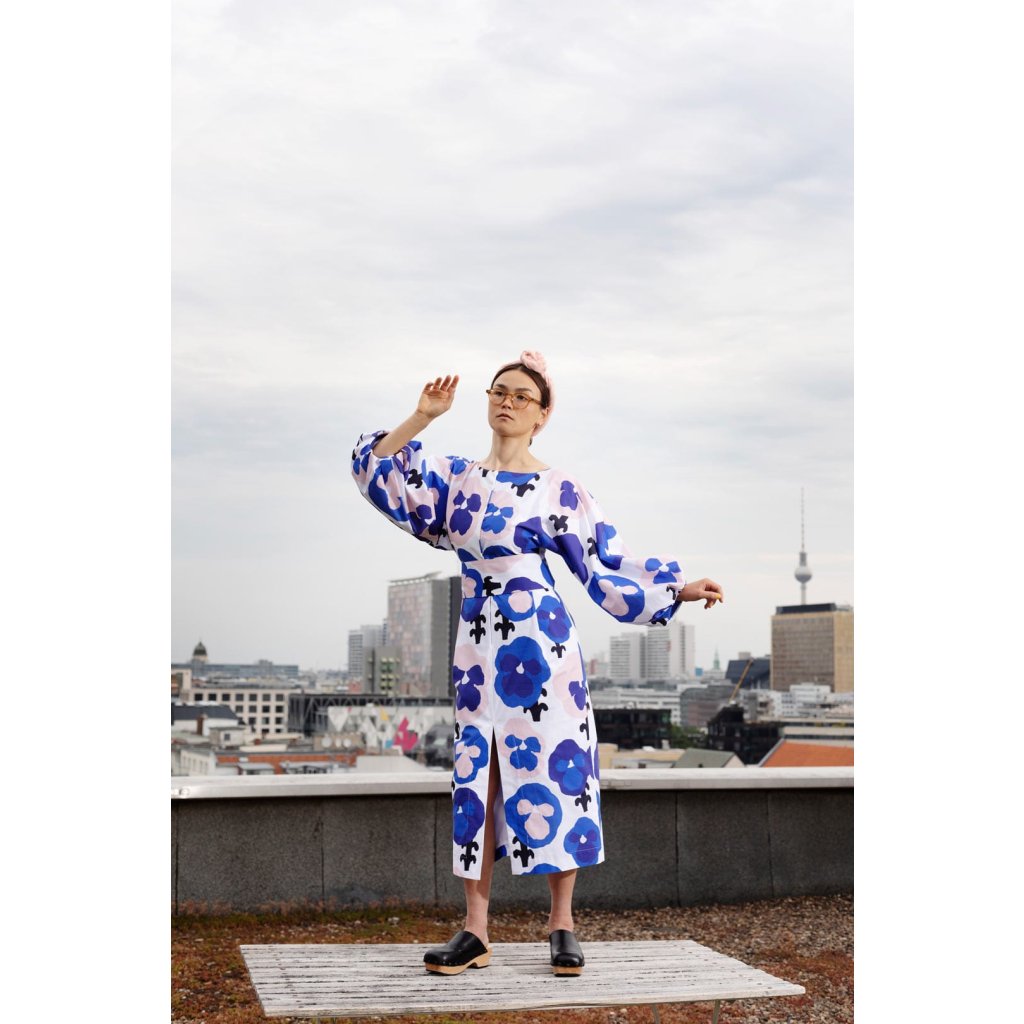 Mila Moisio, šéfredaktorka a spoluzakladatelka TAUKO Magazine. Šaty AURELIA vznikly inspirované nádhernou fotografií Piny Bausch od Waltera Vogela z roku 1966, na které má oblečené šaty s lodičkovým výstřihem a objemnými rukávy.