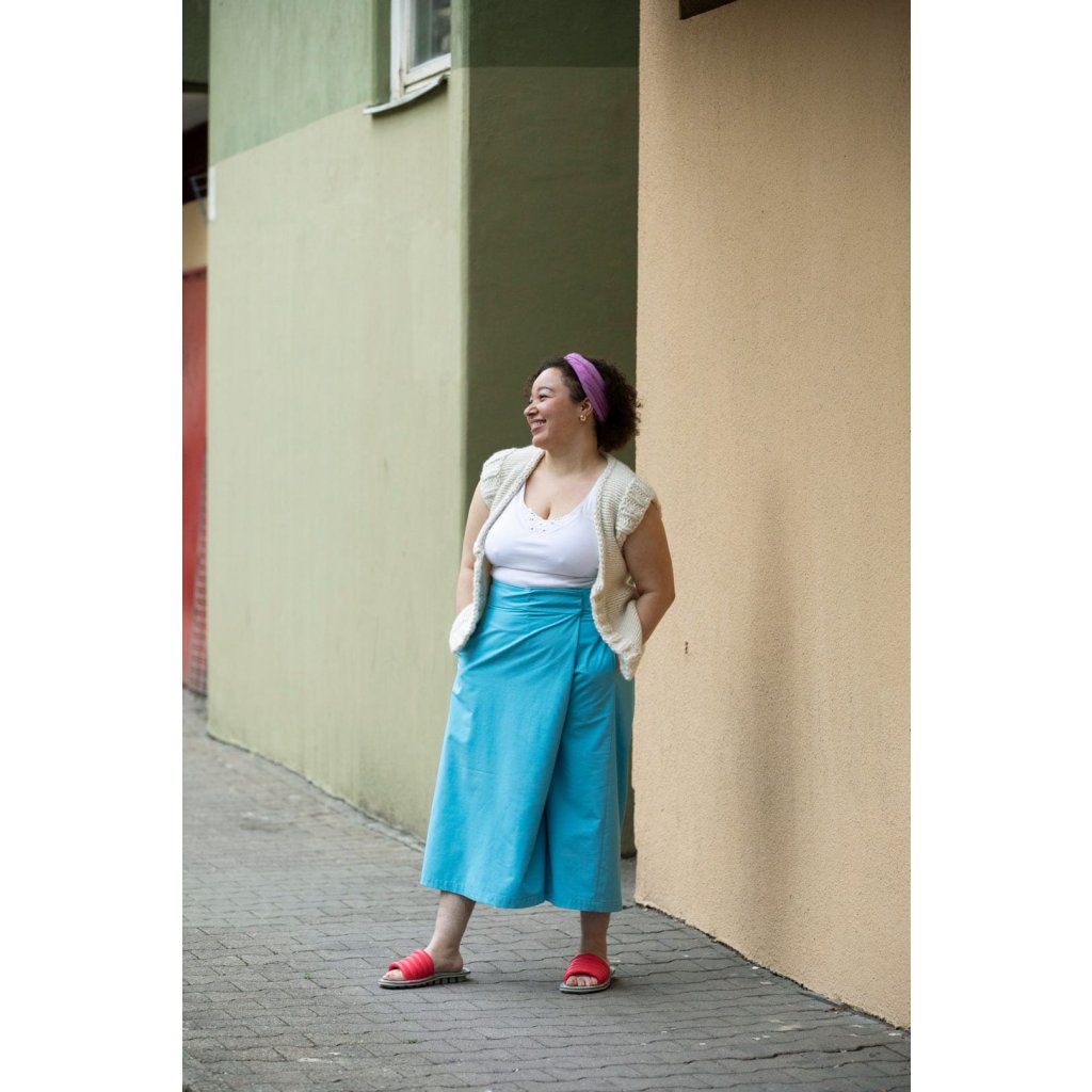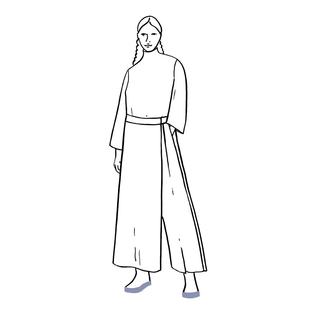 Černý model je ušitý z plisovaného úpletu (65 % polyester, 35 % viskóza, 250 g/m²) a z bavlněného saténu (200 g/m²) ze zásob designérky. Tyrkysový model je ušitý z recyklovaného polybavlněného povlečení (140 g/m²) ze zásob designérky.
