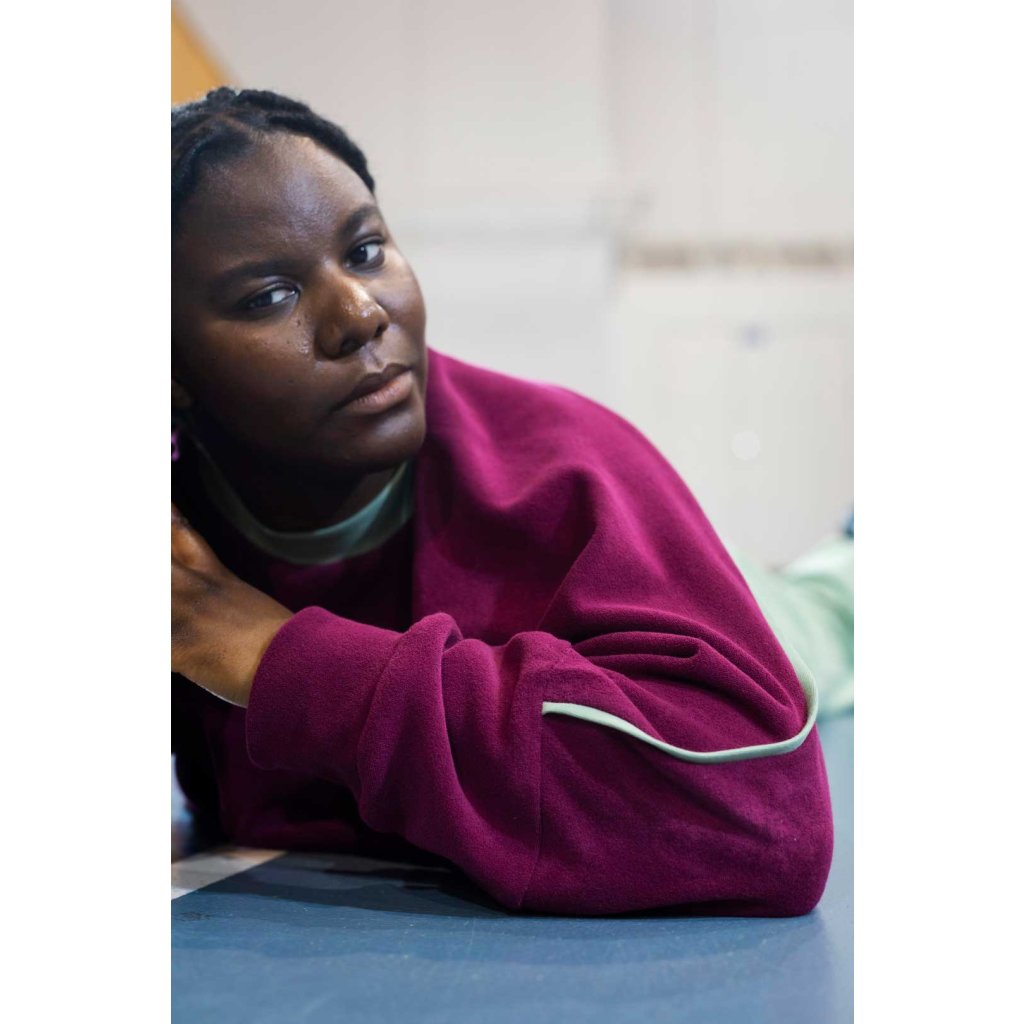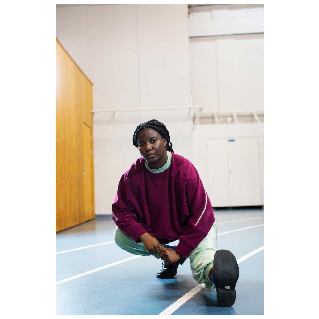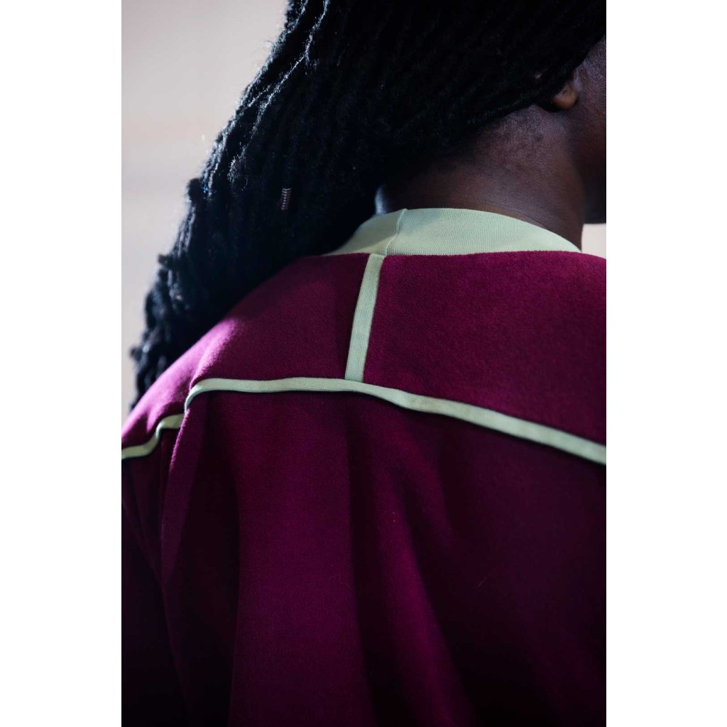 Zvolte střední až silné úplety pro sportovní a aktivní verze. Pro větší pohodlí a teplo použijte pletáž či plyšovou látku. Pro ležérní vzhled volte středně těžký len. Pro útulný pocit použijte dvojitou gázovinu a pro elegantní vzhled splývavé materiály, jako je hedvábí nebo Tencel. Zelený model je ušit z 100 % bavlny, 330 g/m² a fialový model je z 100 % bavlny, 290 g/m². Lem výstřihu a páska jsou ušity z 1x1 žebrovaného bavlněného nápletu.