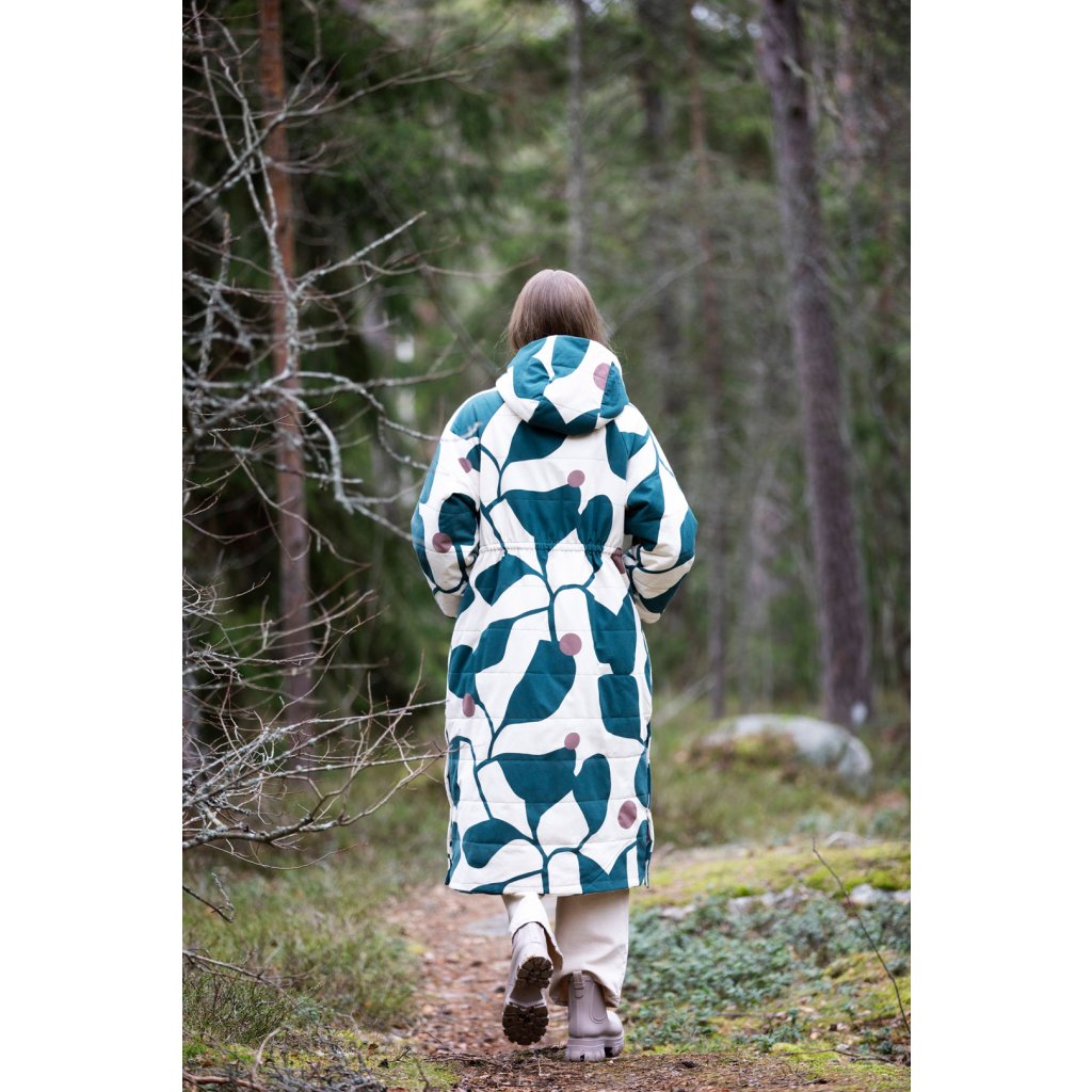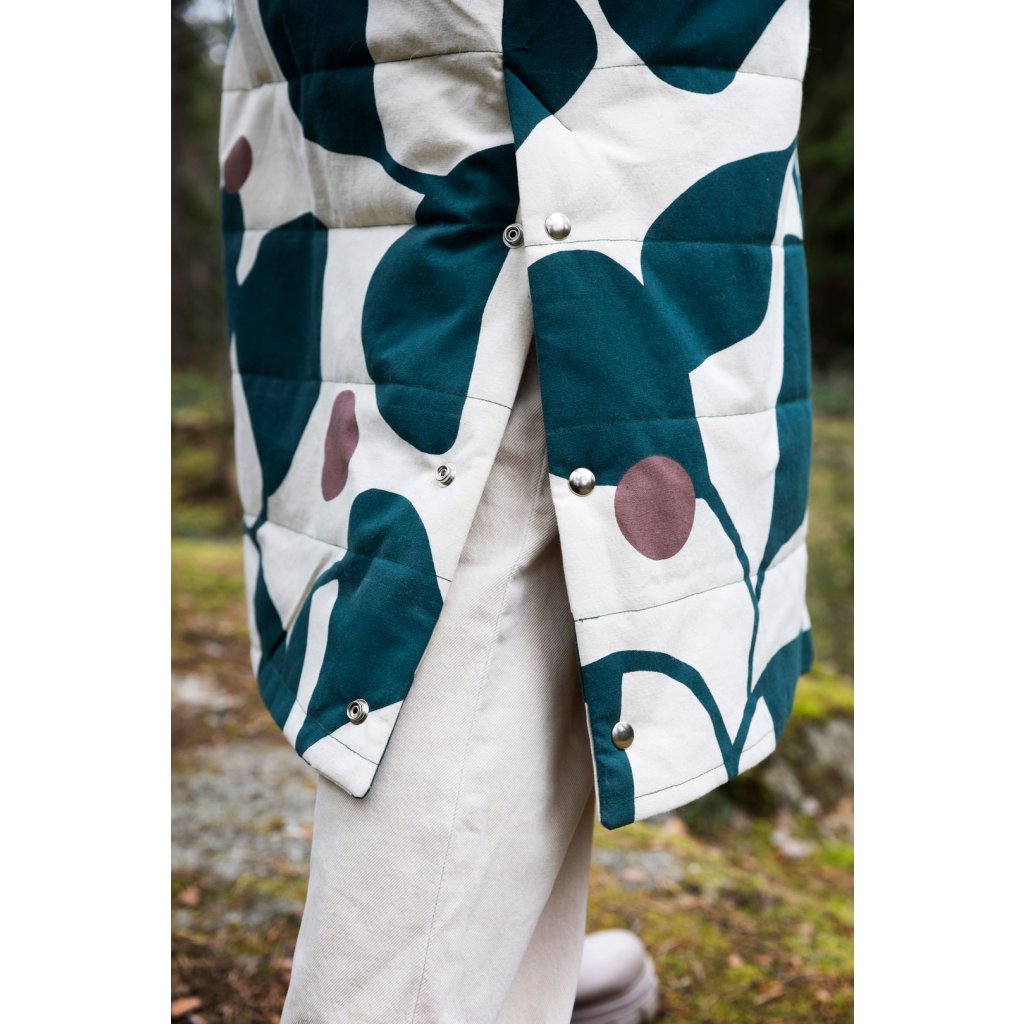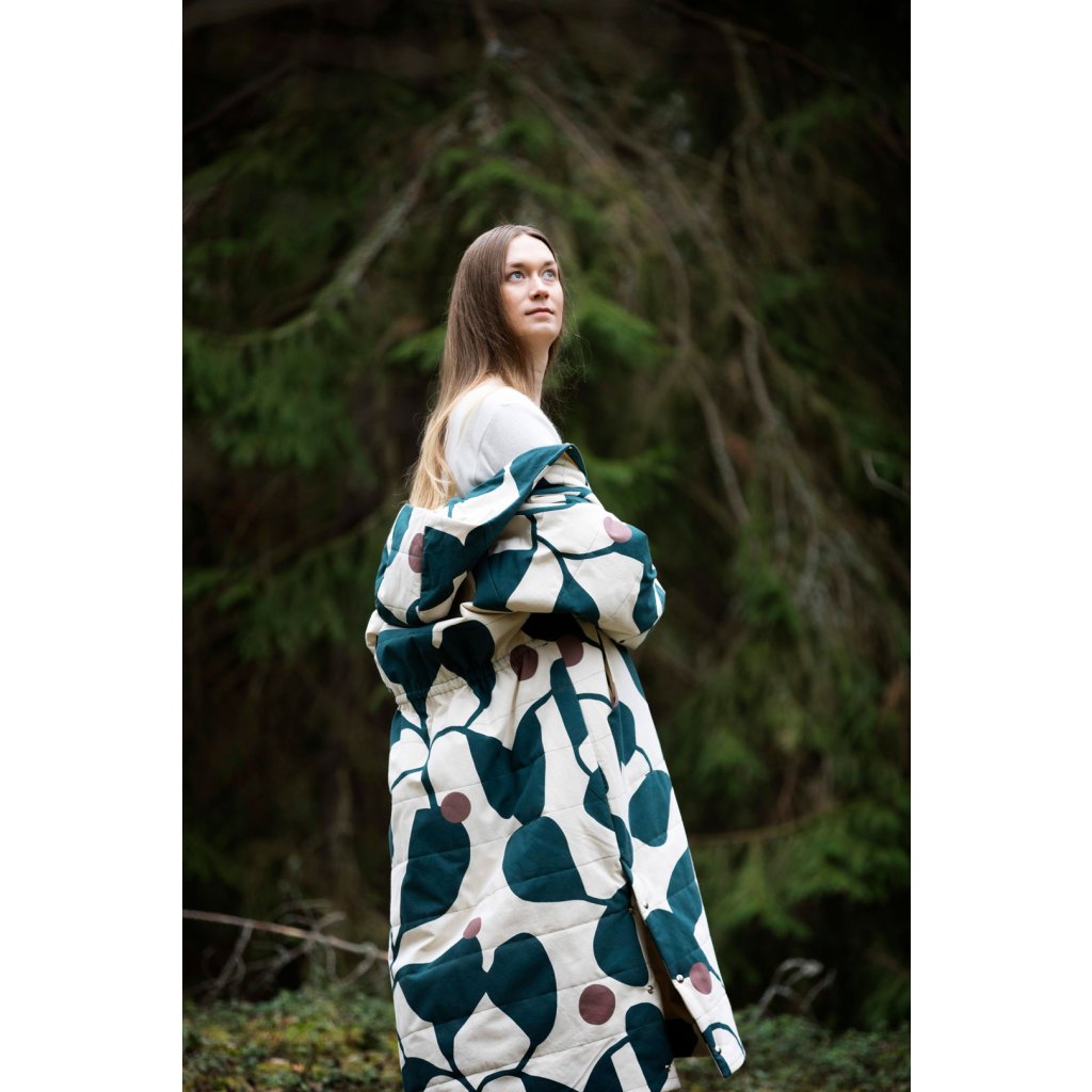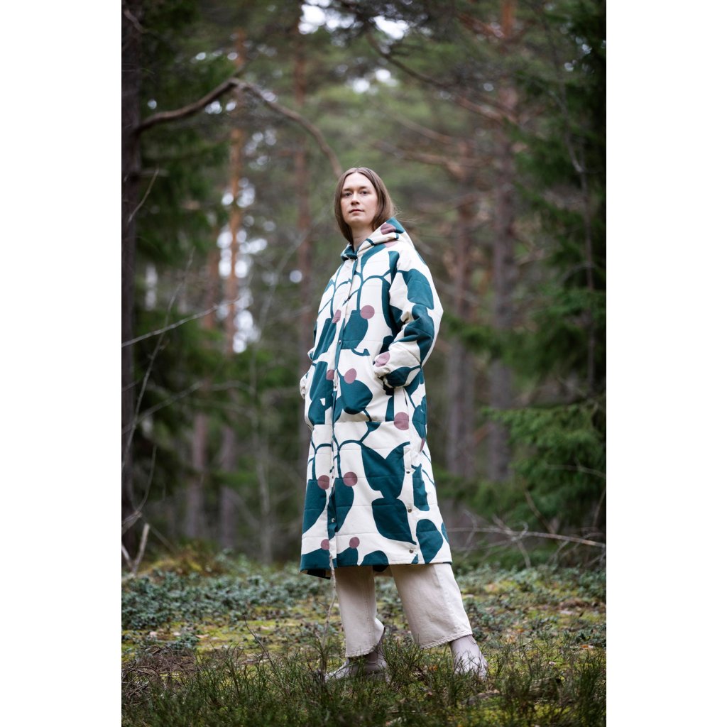 Ukázkový kabát je ušit ze 100 % bavlny, 400 g/m². Vatelín je z vlněného fleecu (85 % nová vlna, 15 % polyester, 180 g/m²). Podšívka z vlastní zásoby designérky. Šňůrka v pase: přírodní tubulární páska 1,5 cm (100 % organická bavlna). Bunda je vyrobena z tmavě zeleného voděodolného plátna (100 % organická bavlna, 300 g/m²).