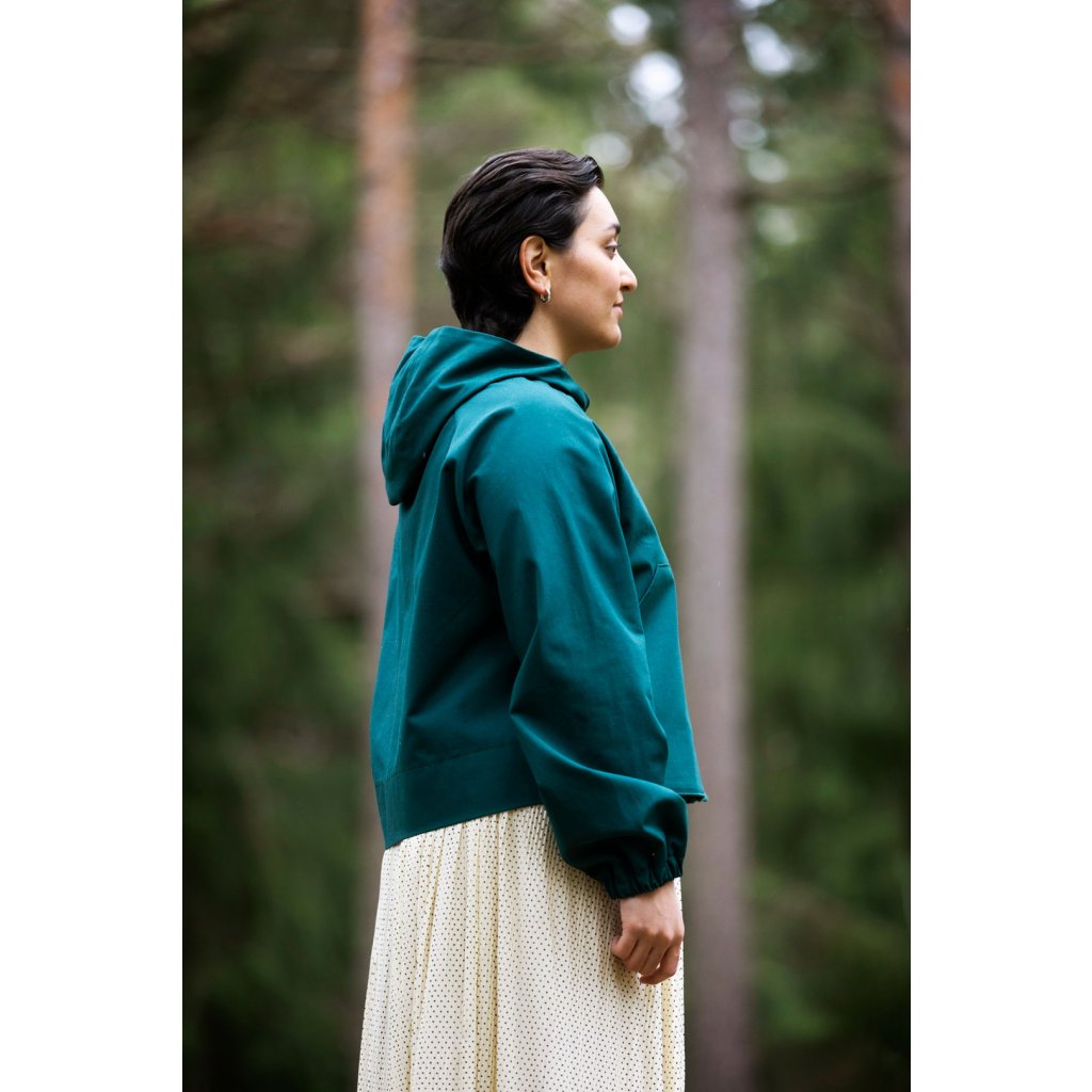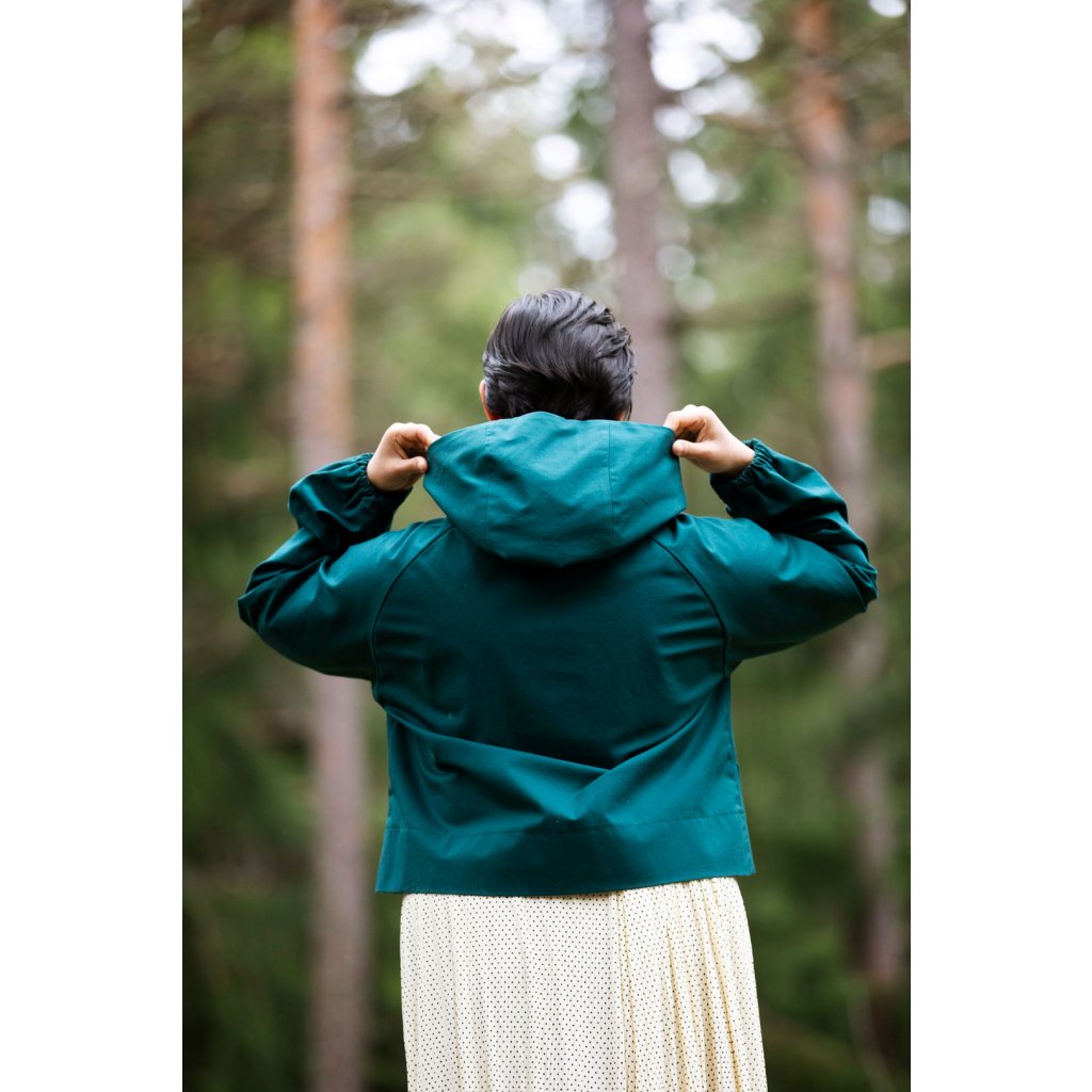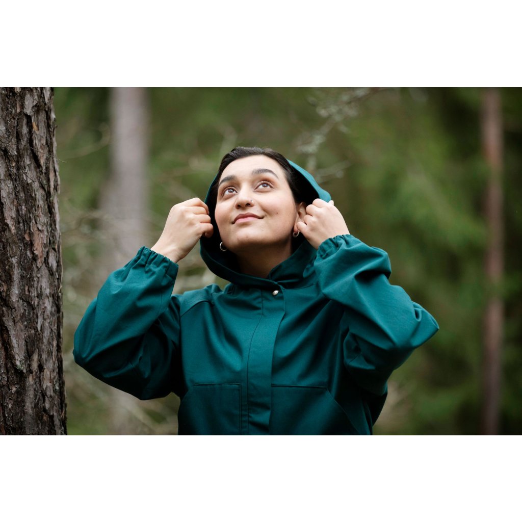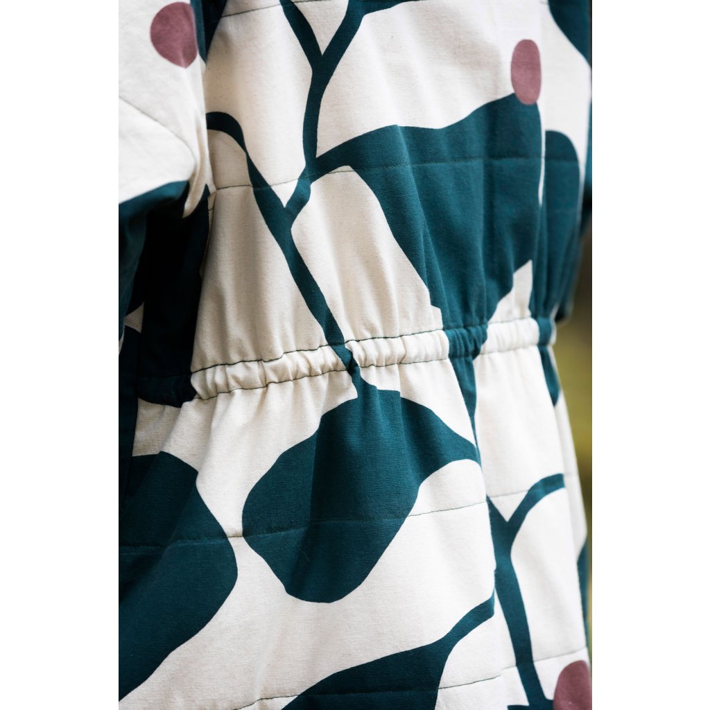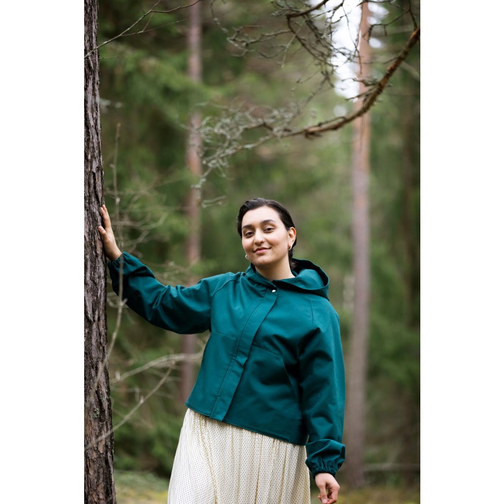 Ukázkový kabát je ušit ze 100 % bavlny, 400 g/m². Vatelín je z vlněného fleecu (85 % nová vlna, 15 % polyester, 180 g/m²). Podšívka z vlastní zásoby designérky. Šňůrka v pase: přírodní tubulární páska 1,5 cm (100 % organická bavlna). Bunda je vyrobena z tmavě zeleného voděodolného plátna (100 % organická bavlna, 300 g/m²).