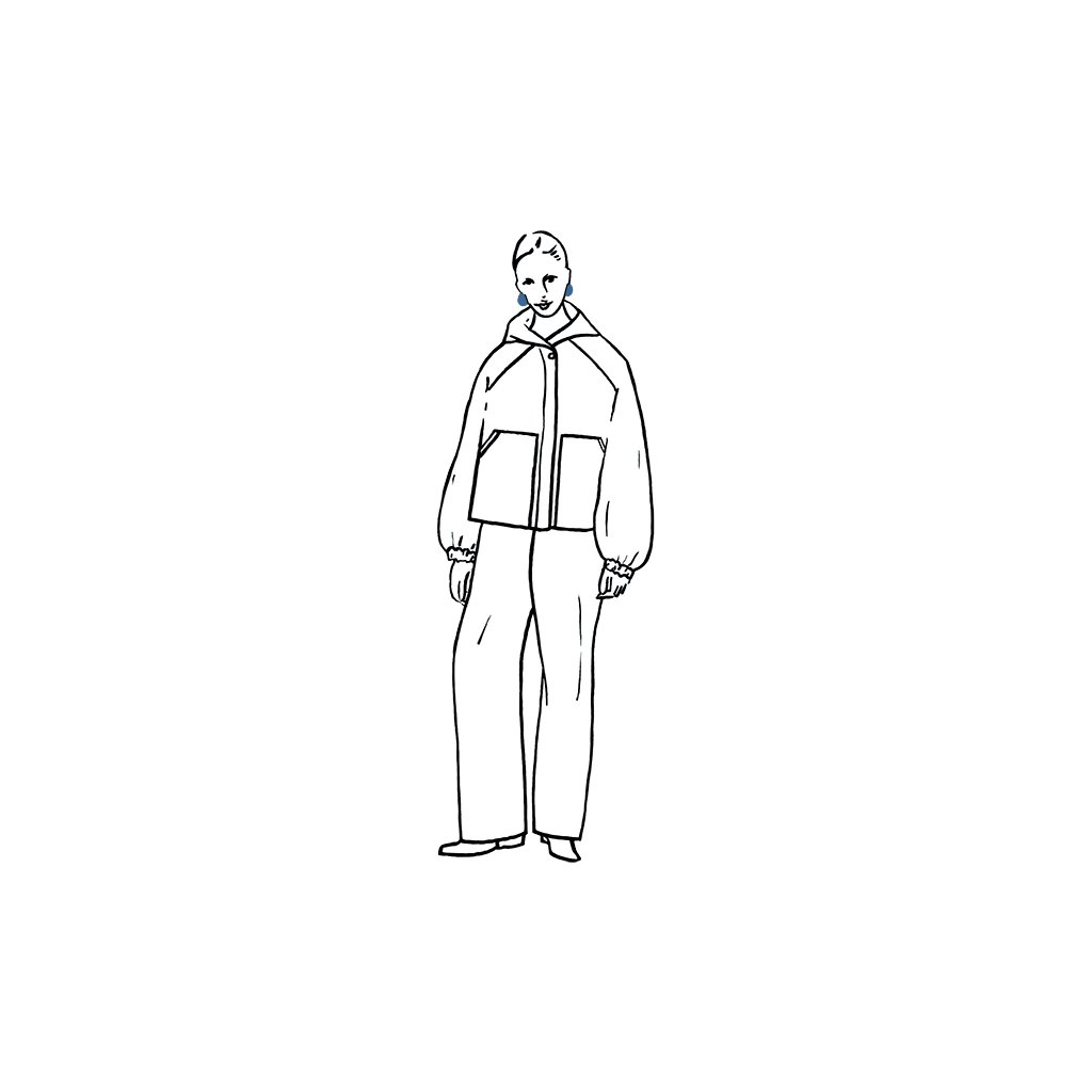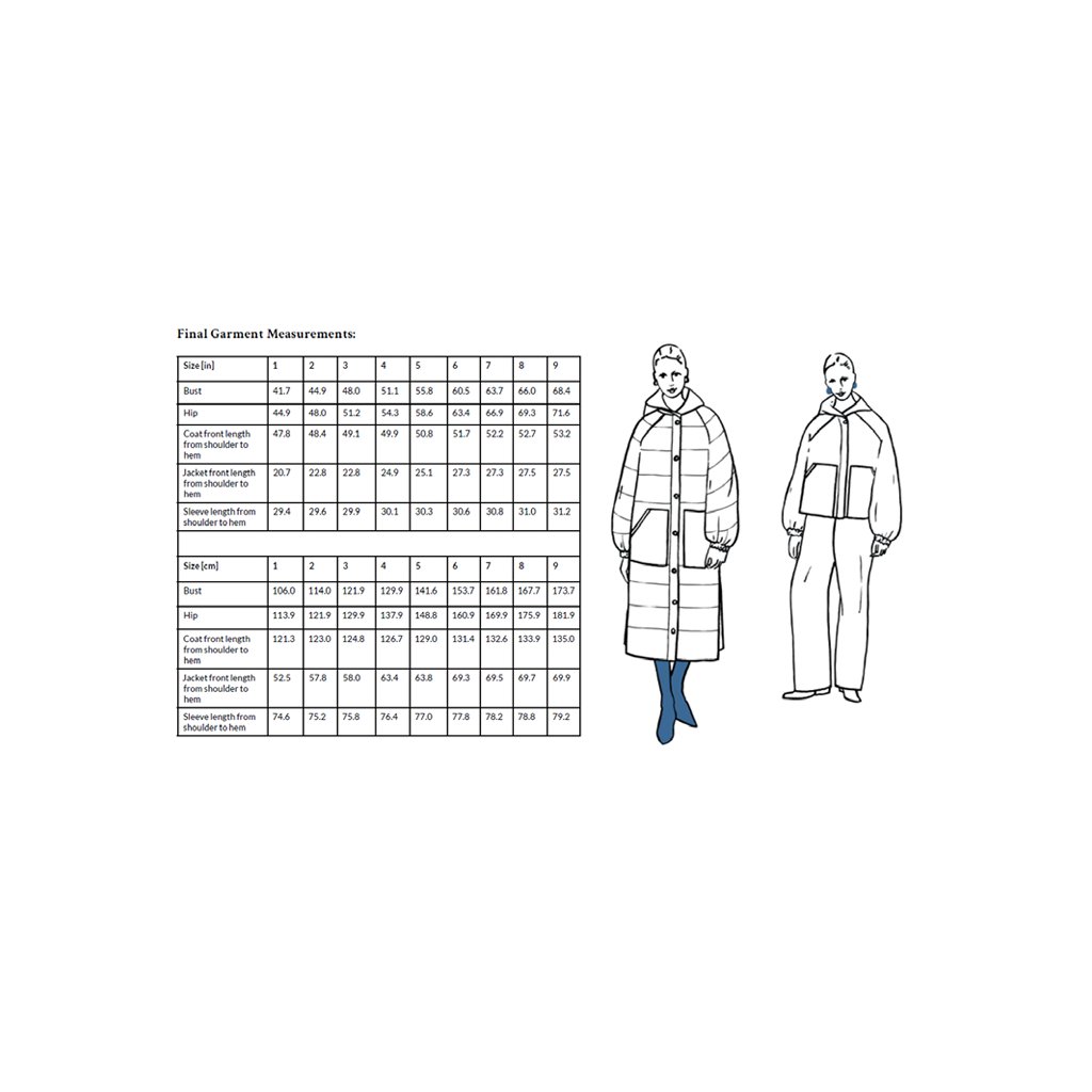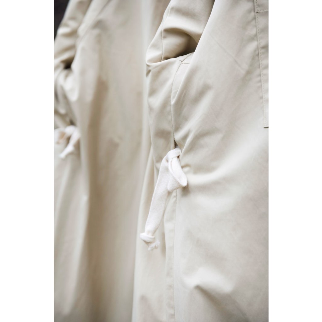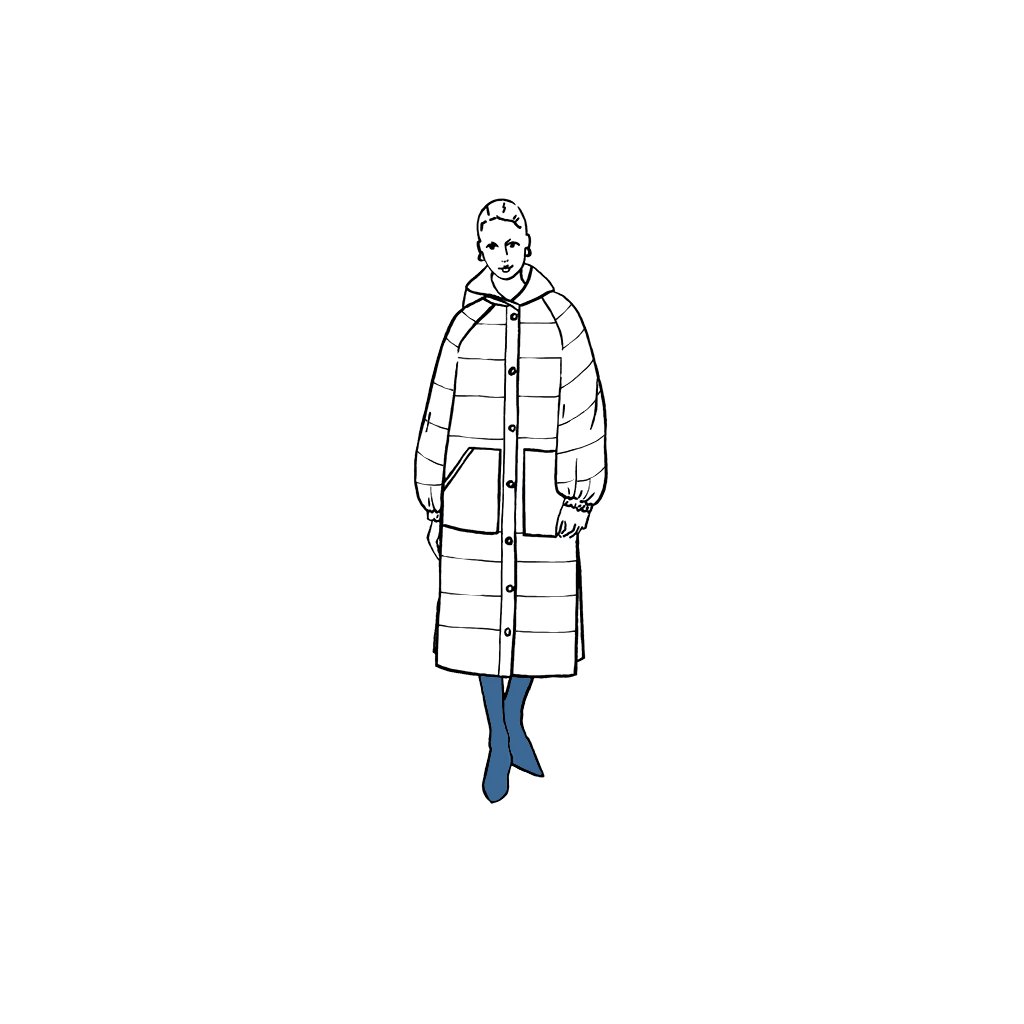 Ukázkový kabát je ušit ze 100 % bavlny, 400 g/m². Vatelín je z vlněného fleecu (85 % nová vlna, 15 % polyester, 180 g/m²). Podšívka z vlastní zásoby designérky. Šňůrka v pase: přírodní tubulární páska 1,5 cm (100 % organická bavlna). Bunda je vyrobena z tmavě zeleného voděodolného plátna (100 % organická bavlna, 300 g/m²).