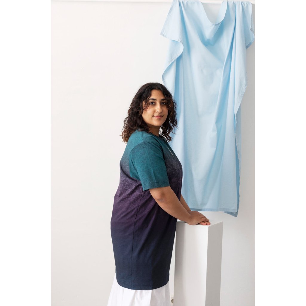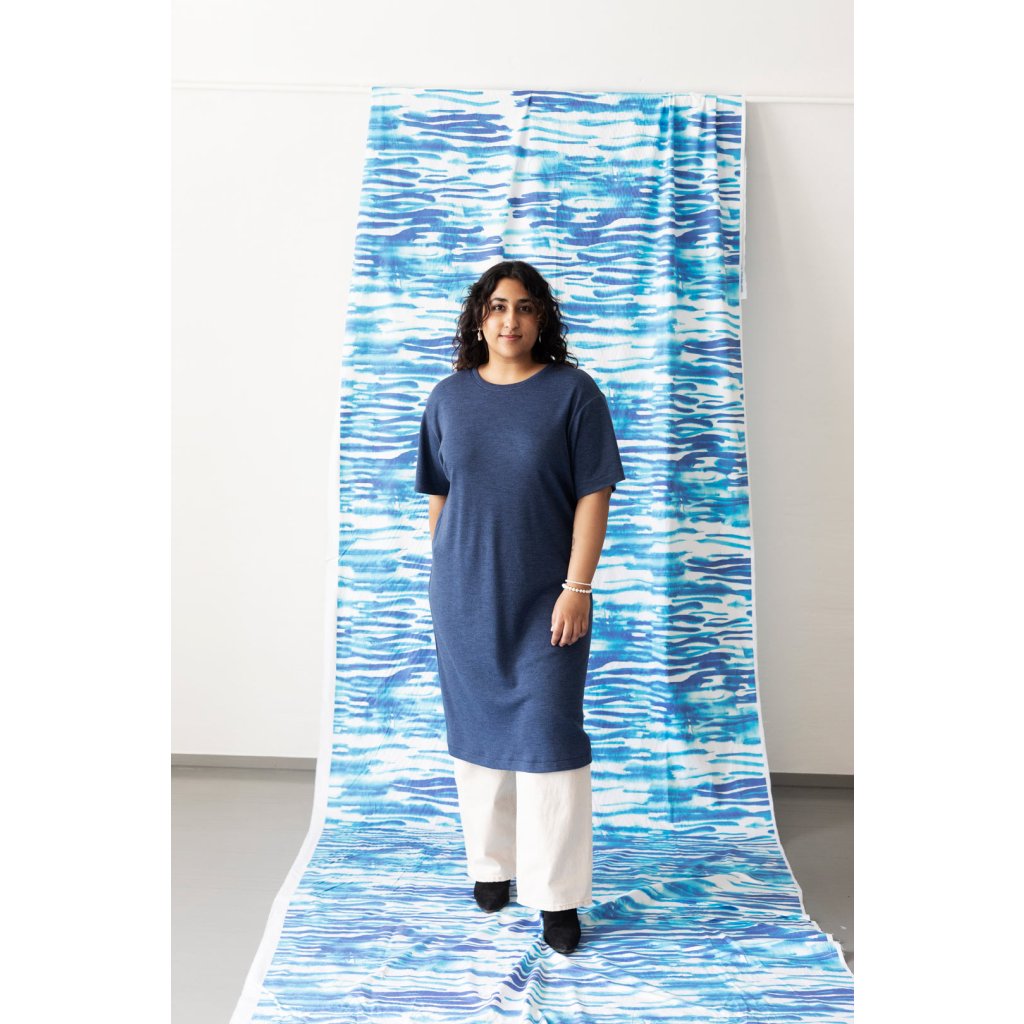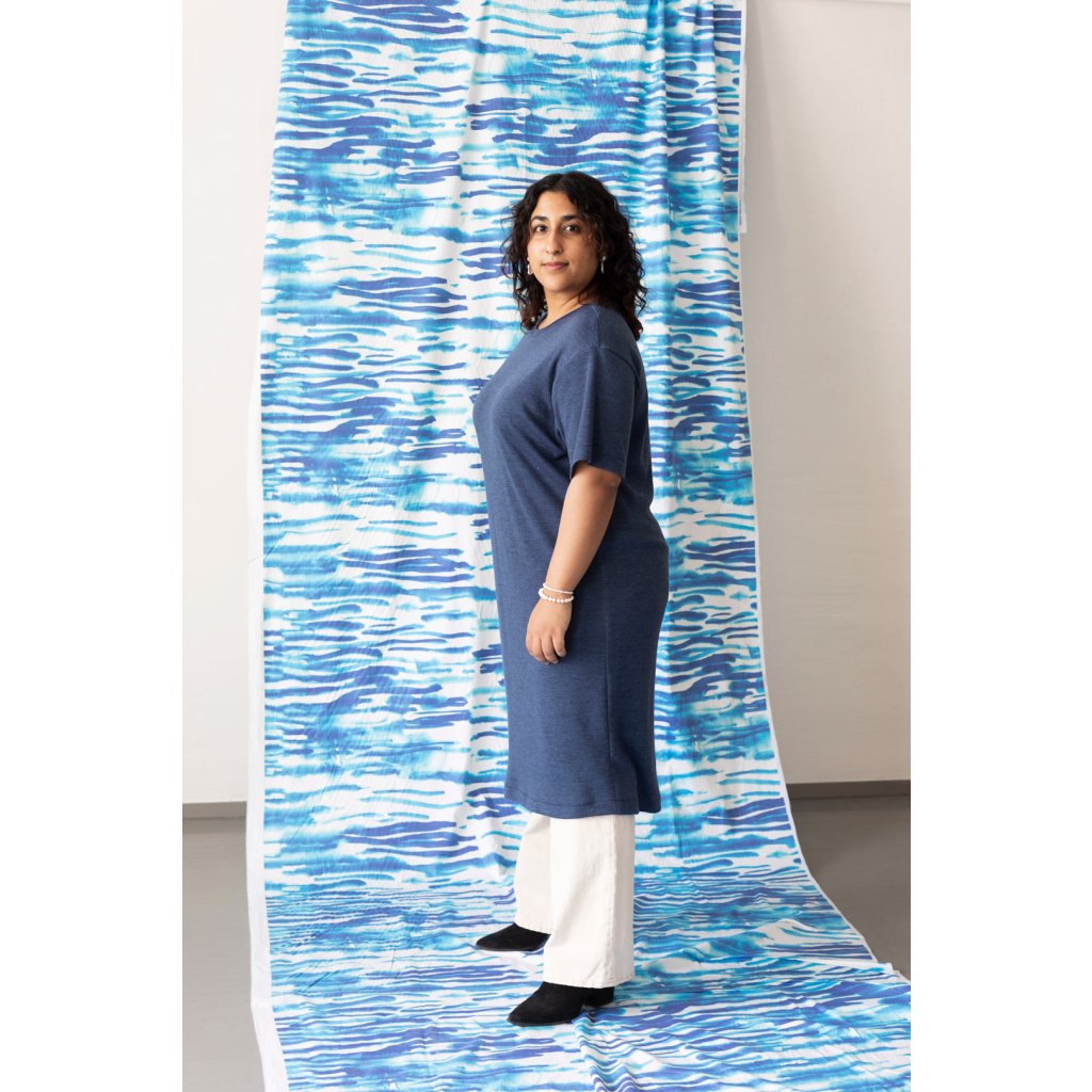 Zvolte středně těžké úplety a elastické látky, například jersey, svetroviny, vlněné úplety nebo Tencel úplety. Ukázkový top je ušit z 95 % organické bavlny, 5 % elastanu, 210 g/m² v barvě krémové a tunika z 95 % organické bavlny, 5 % elastanu, 210 g/m². Šaty jsou ze 100 % merino vlny bez mulesingu, 250 g/m².