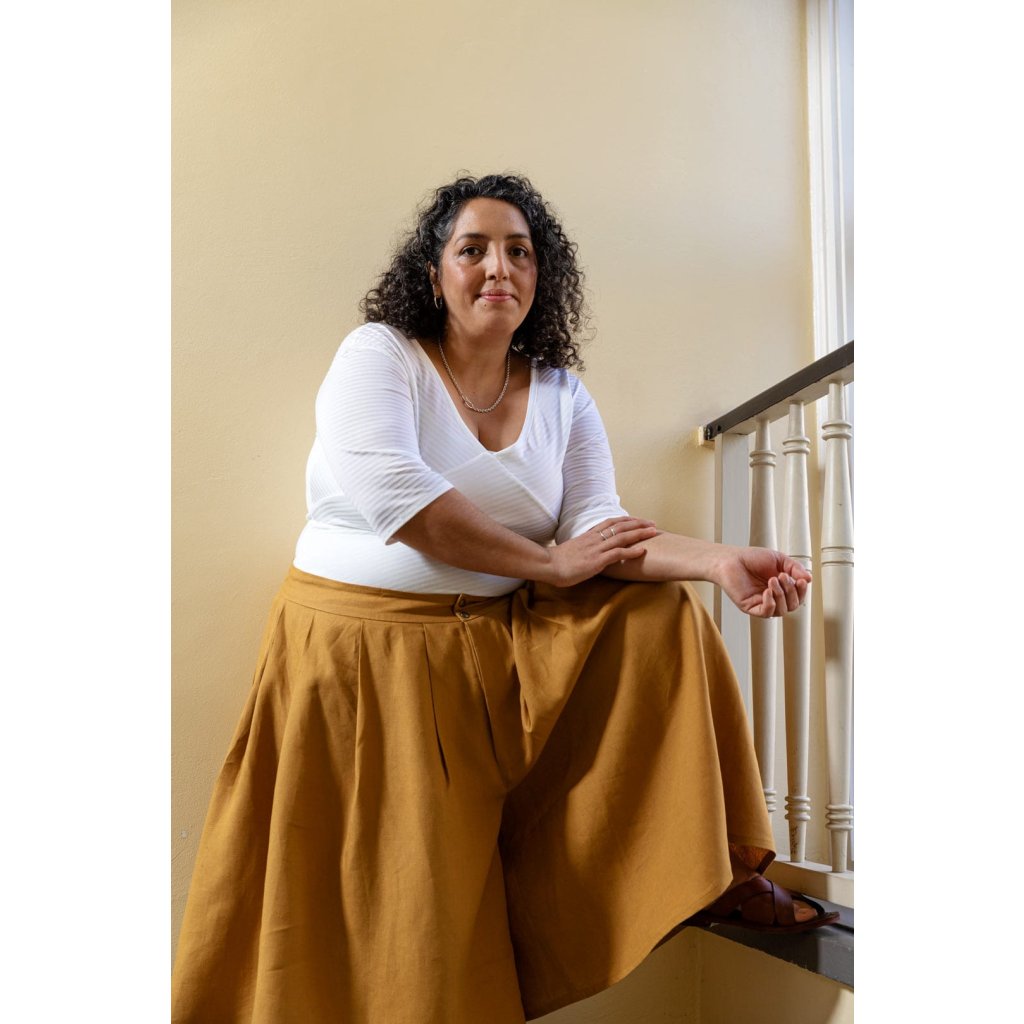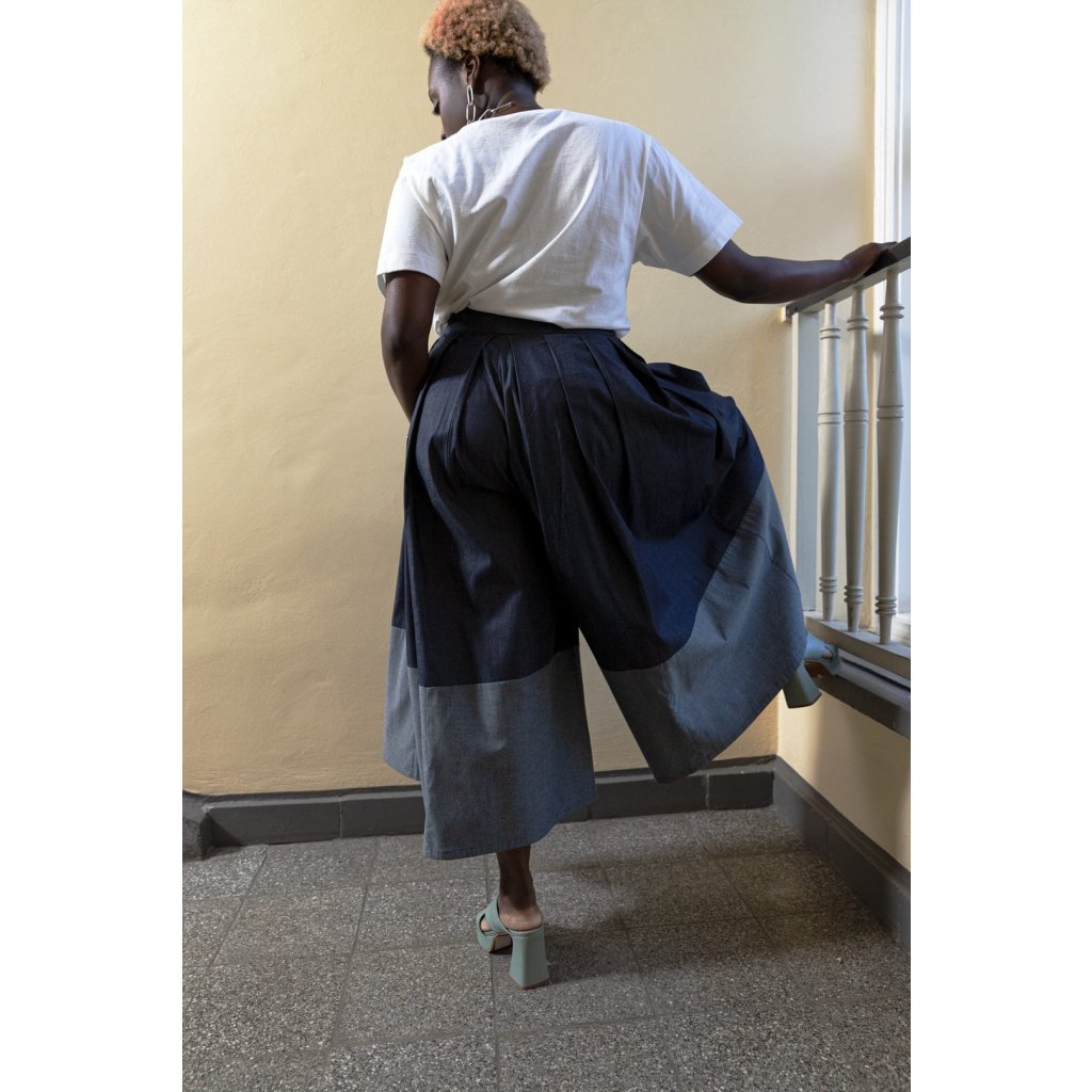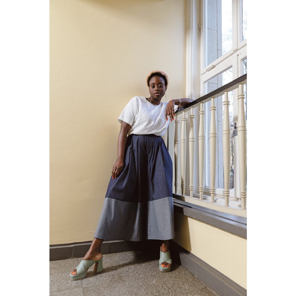 Bayi Amoussou má na sobě džínové kalhoty PANEL ve velikosti 2. Měří 164 cm. Erica Fernandez má na sobě okrové šortky PANEL ve velikosti 6. Měří 163 cm.