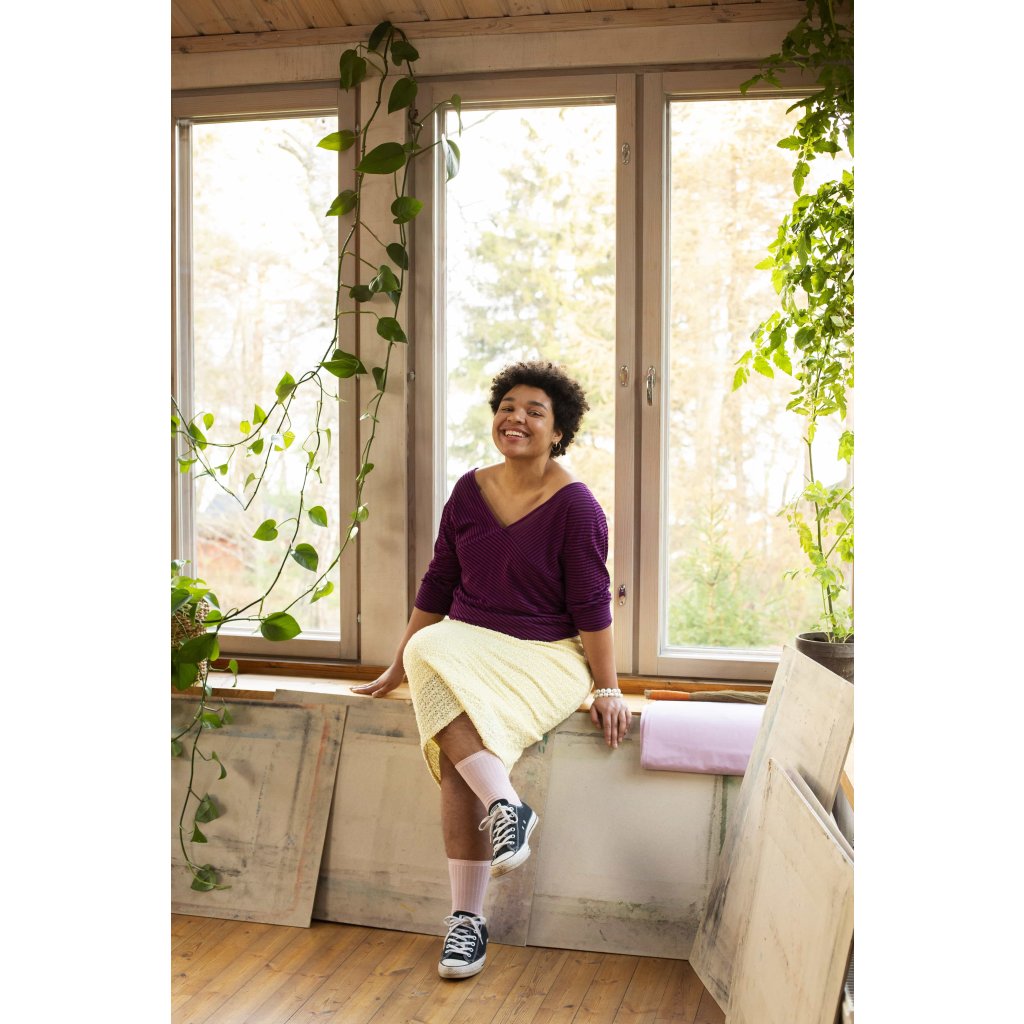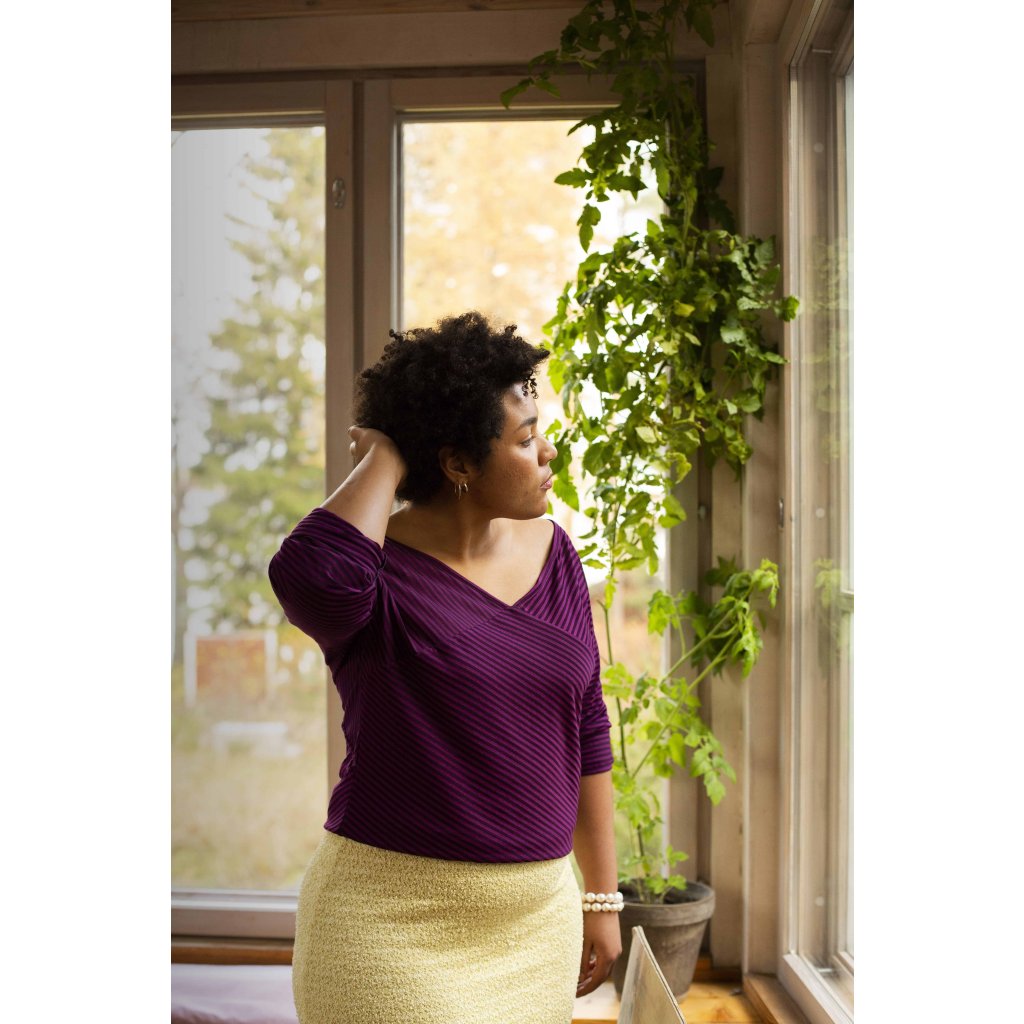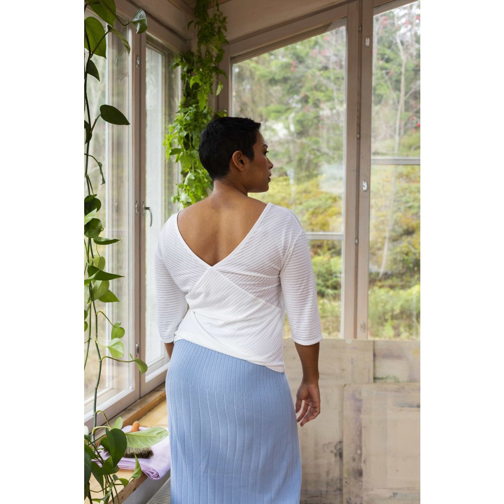 Na top použijte lehký úplet 80 g/m². Ideální jsou průsvitné materiály, které zvýrazní linie střihu; zvážit můžete i krajkové úplety. Zajistěte, aby byl materiál pružný, protože střih nemá žádné zapínání. Ukázkové modely jsou z pruhované průsvitné pleteniny (46 % viskóza, 27 % bavlna, 27 % modal).