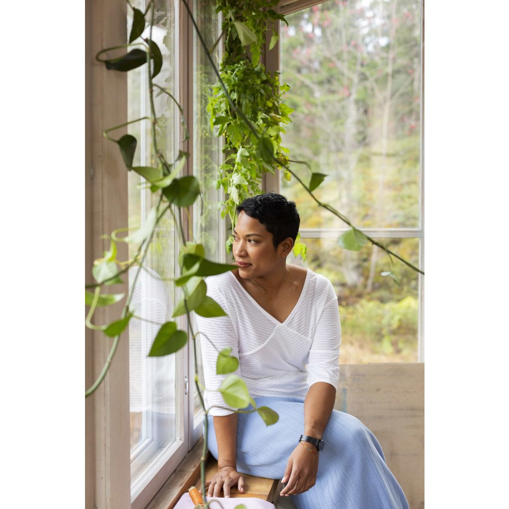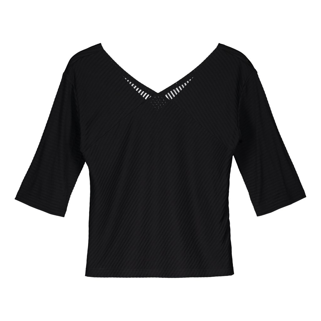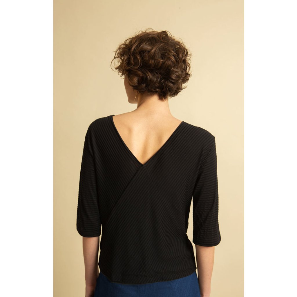 Na top použijte lehký úplet 80 g/m². Ideální jsou průsvitné materiály, které zvýrazní linie střihu; zvážit můžete i krajkové úplety. Zajistěte, aby byl materiál pružný, protože střih nemá žádné zapínání. Ukázkové modely jsou z pruhované průsvitné pleteniny (46 % viskóza, 27 % bavlna, 27 % modal).