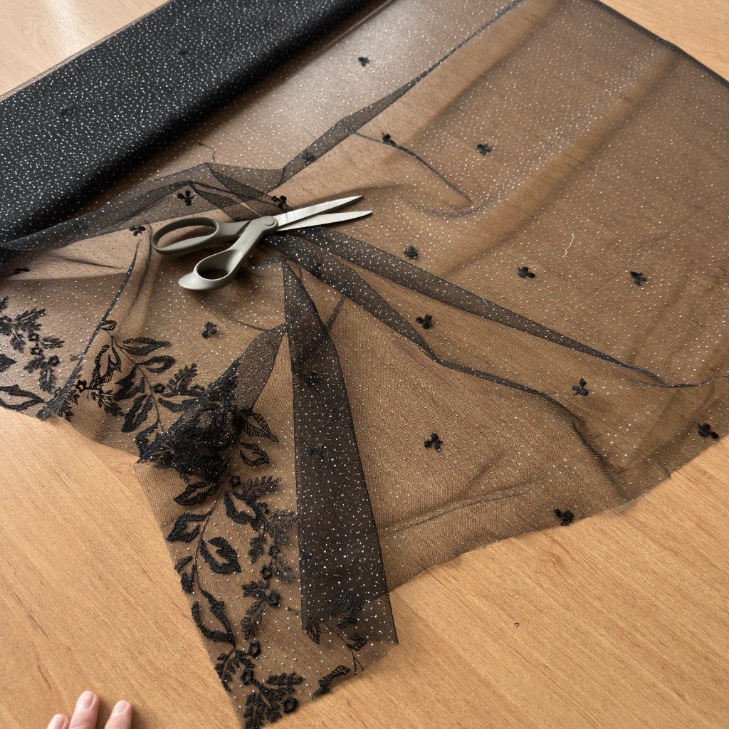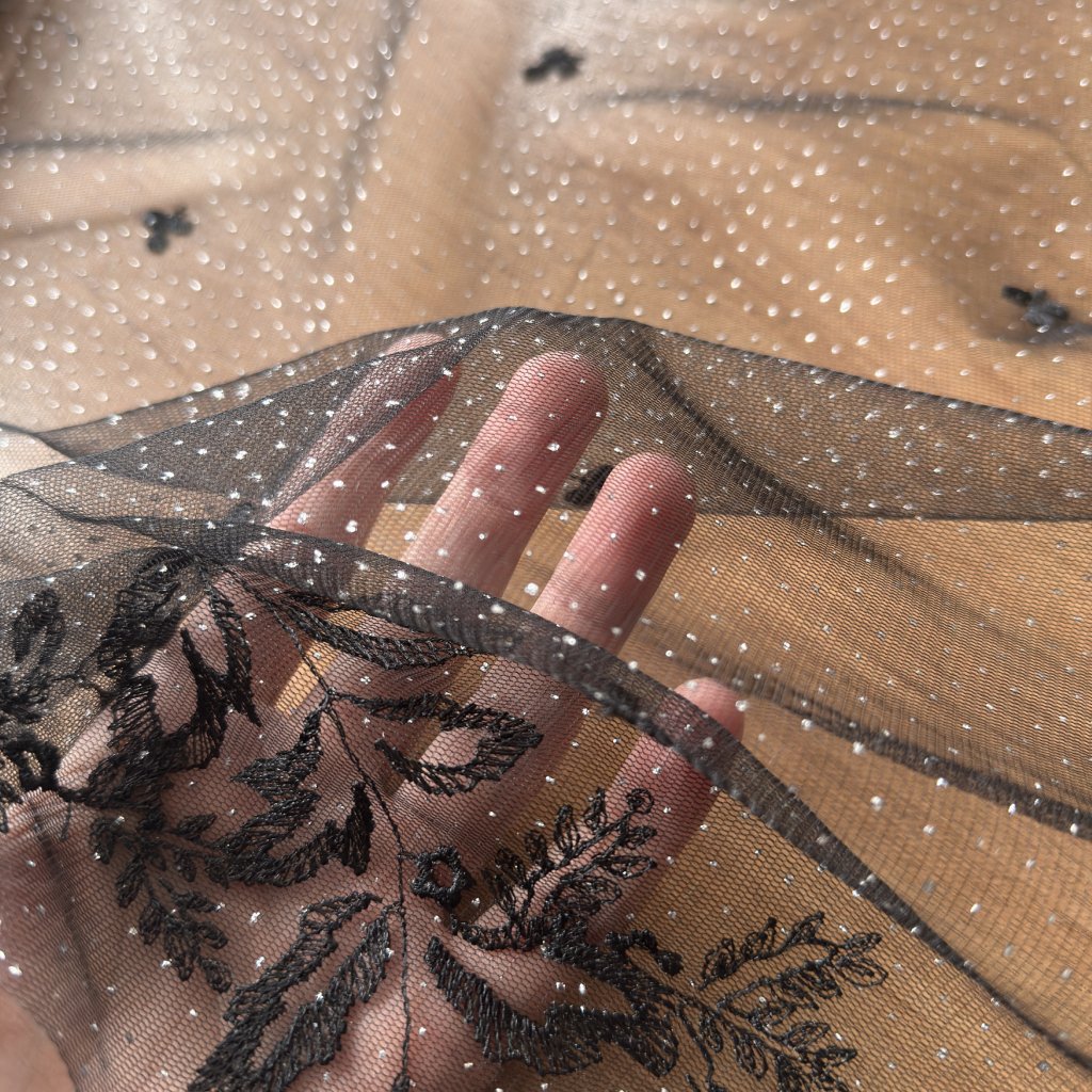 Tyl černý výšivka, stříbrné třpytky 2