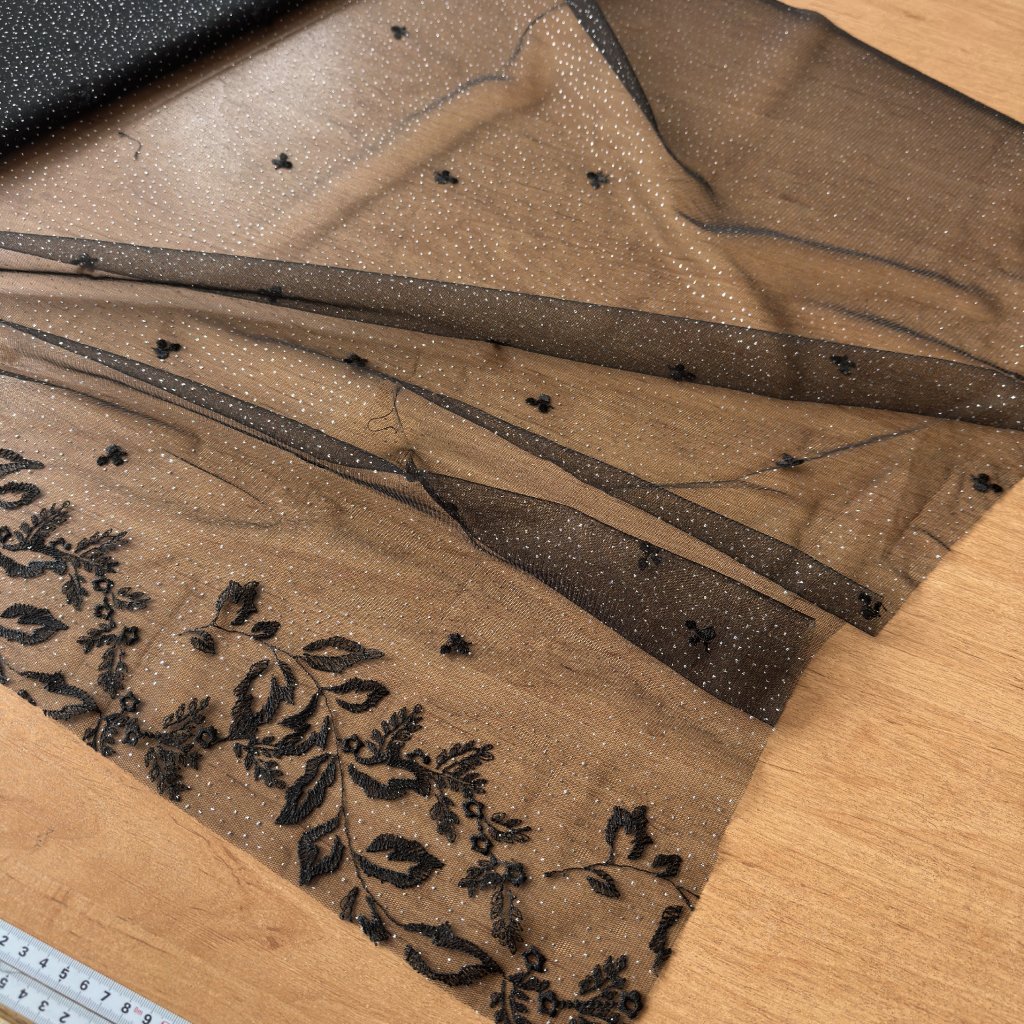 Tyl černý výšivka, stříbrné třpytky