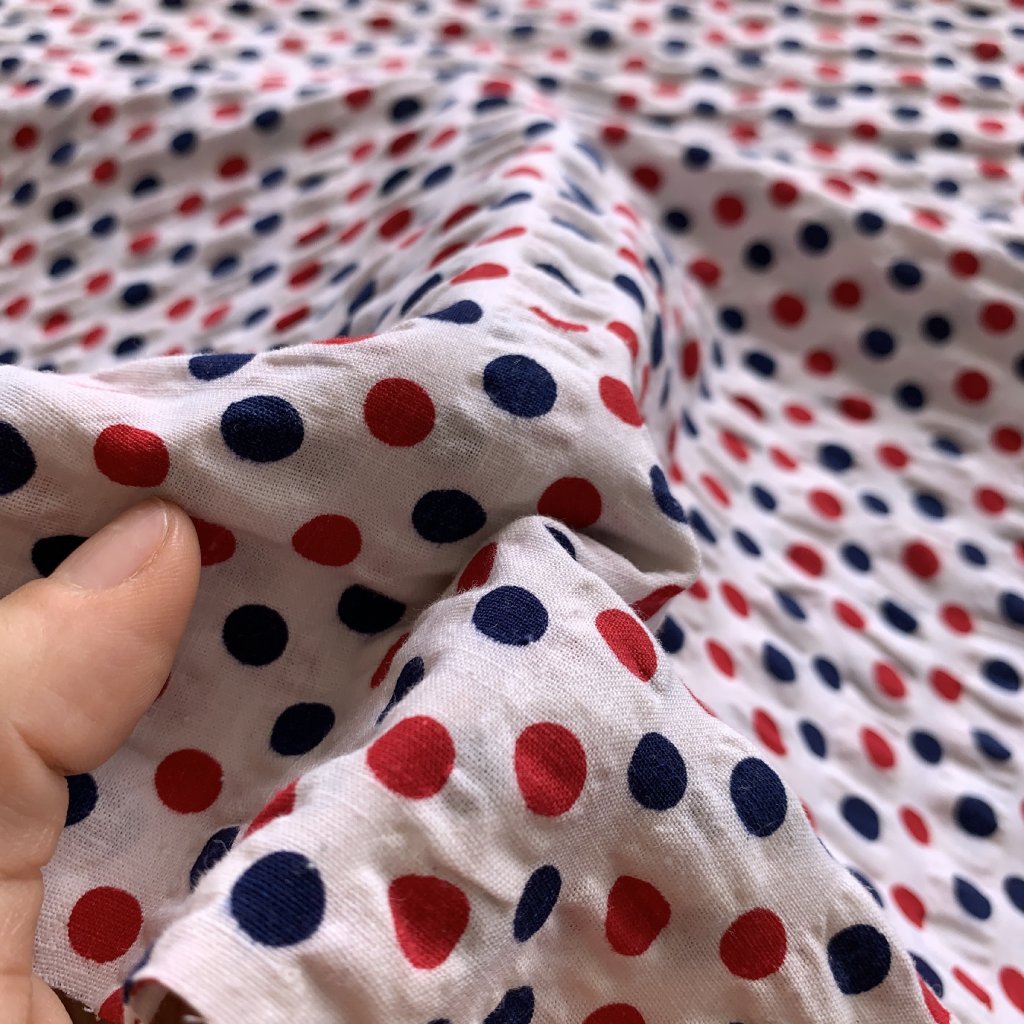 Vzorek - Bavlněný krep modré puntíky na bílé, Pár zašlých flíčků v délce