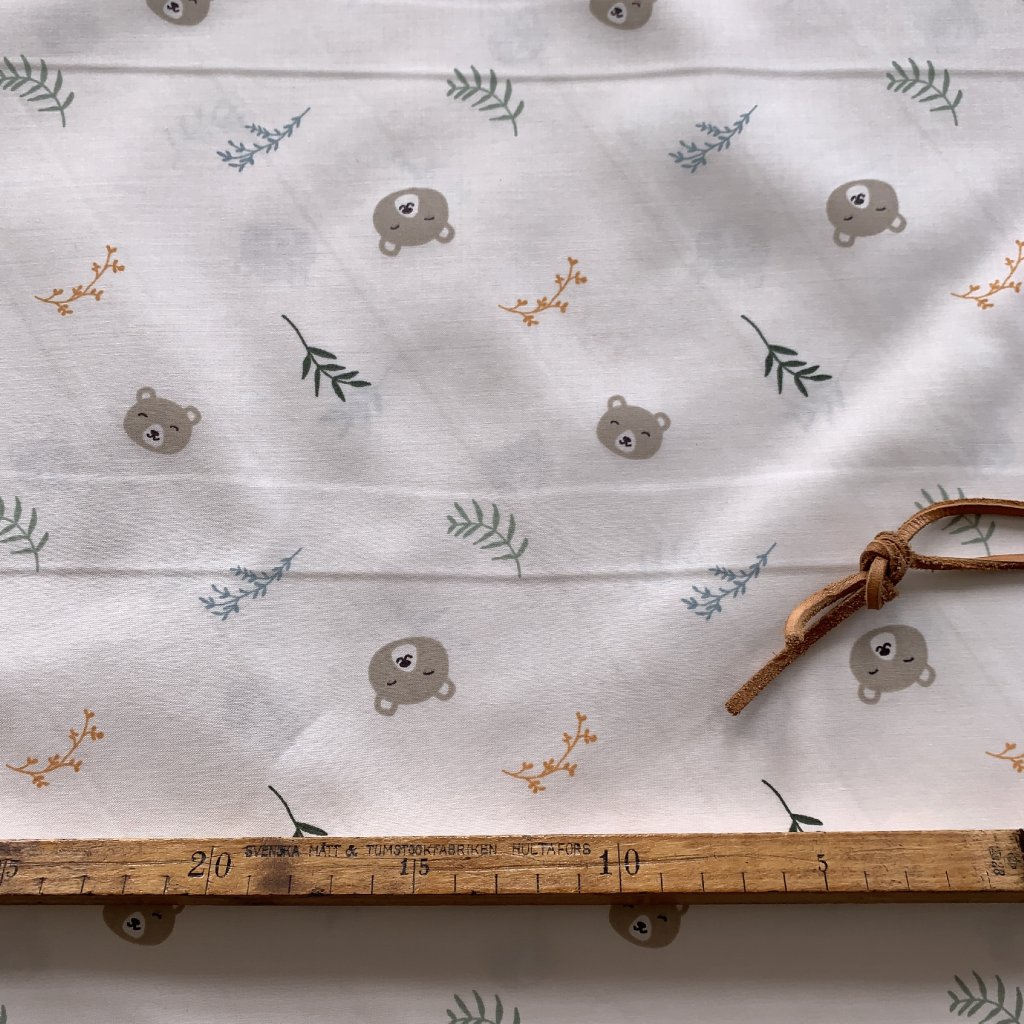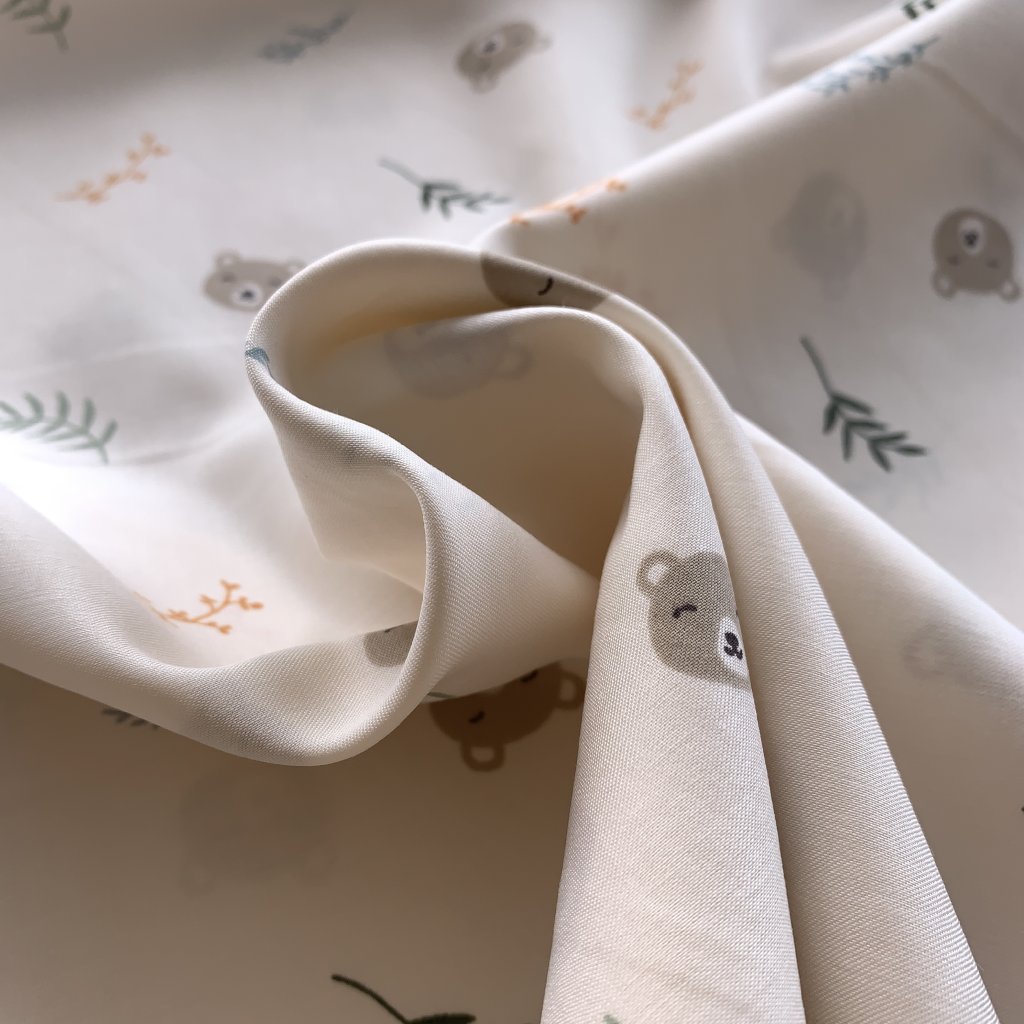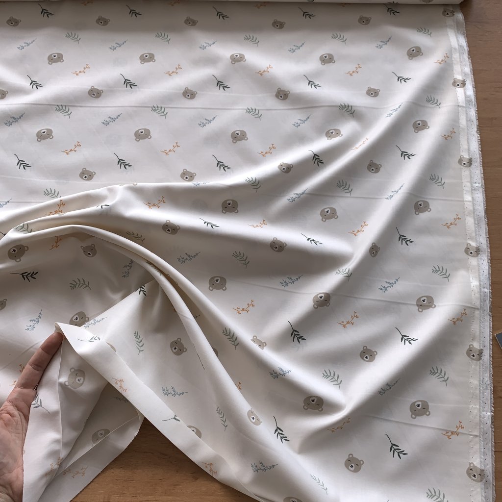 Vzorek - Bavlněný satén medvídci a větvičky na krémové 5 (kazy)