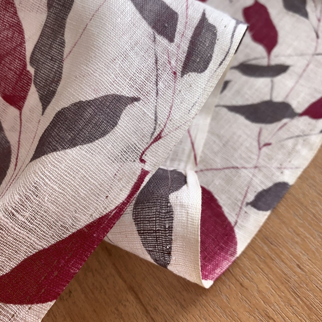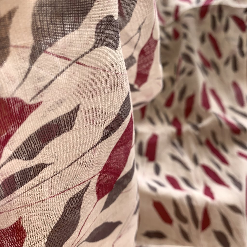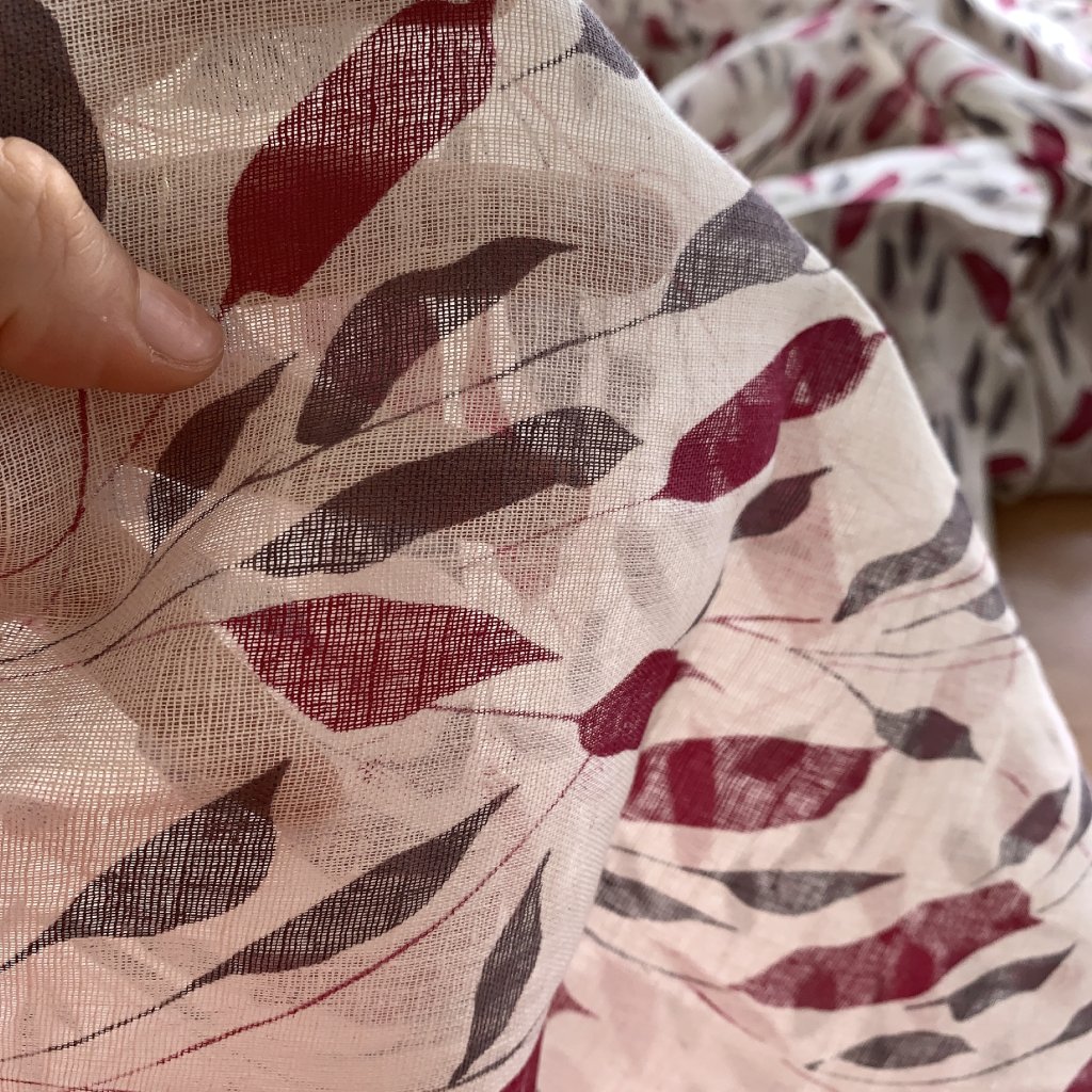 Vzorek - Dekorační bavlna/gázovina vínové a šedé listy