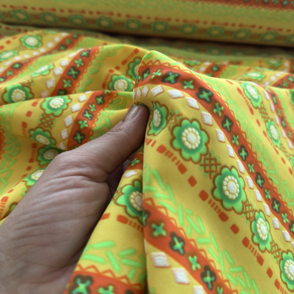 Vzorek - Plavkovina žlutá s květovano geometrickými pruhy, bílé prvky lehce plastický tisk