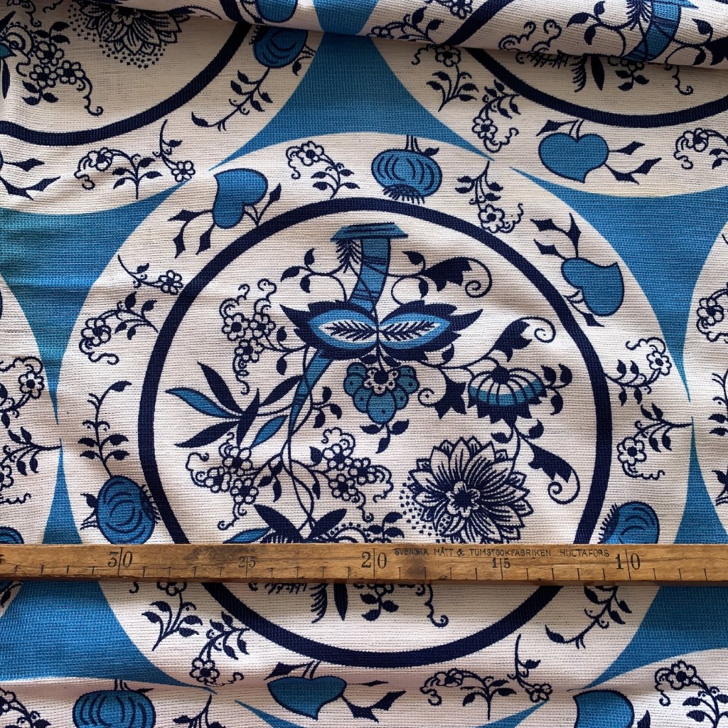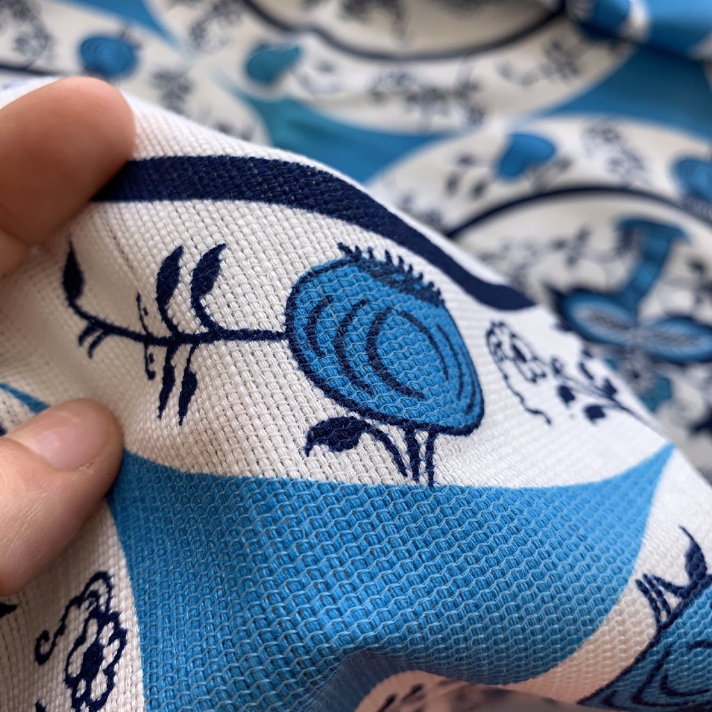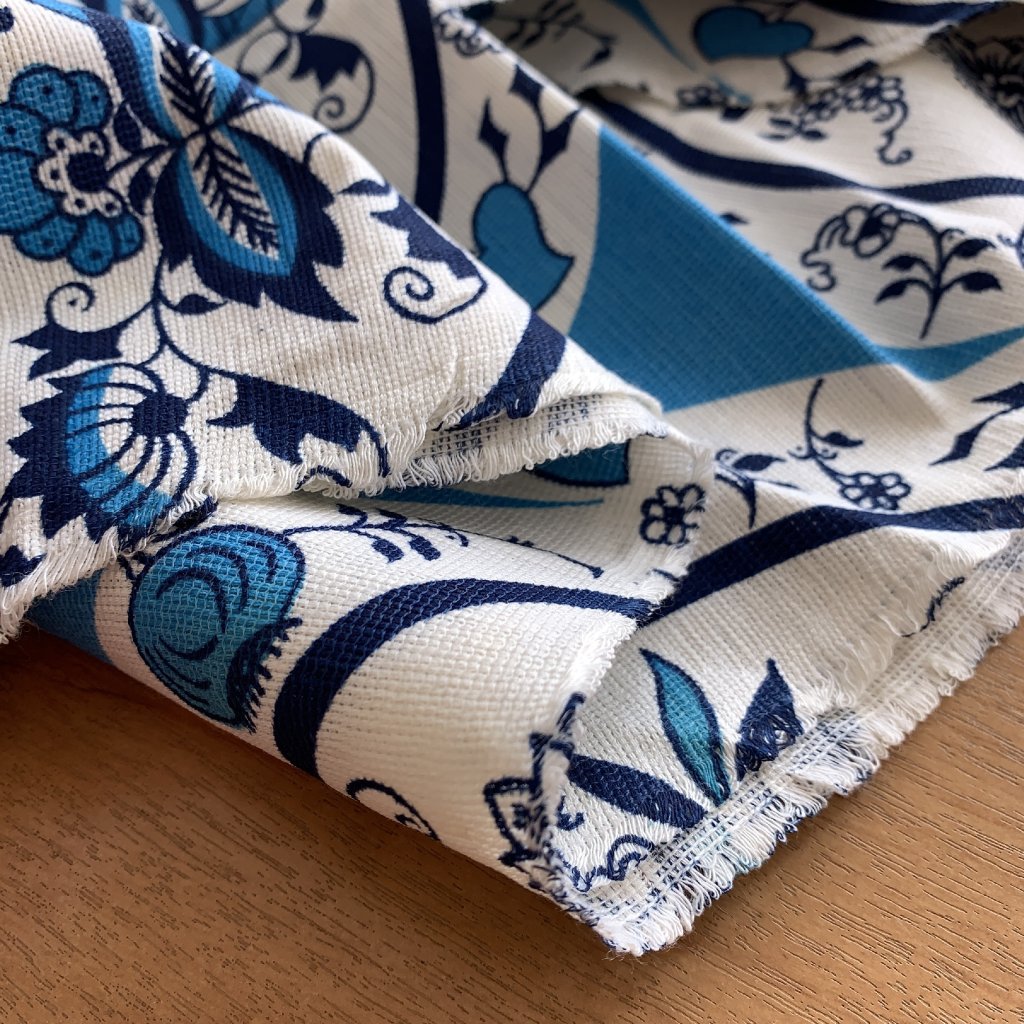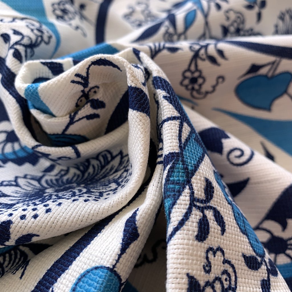 Vzorek - Retro bavlněná dekorační látka folklorní vzor modro bílé květiny (v přehybu lehce zašlé)