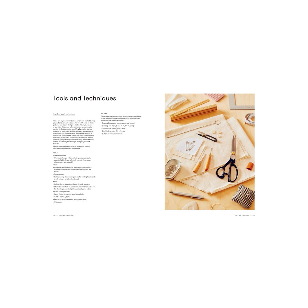 Bezodpadová konstrukce střihu je trochu jako skládačka. Pracujete s předem danou délkou látky od jednoho konce ke druhému a jednotlivé díly střihu do ní strategicky rozvrhnete tak, aby se spotřeboval celý kus materiálu. Díky této jedinečné „bezpapírové“ metodě můžete při svých šicích projektech eliminovat textilní i papírový odpad a zároveň se zbavit obav z vlastního navrhování střihů a šití oblečení na míru.